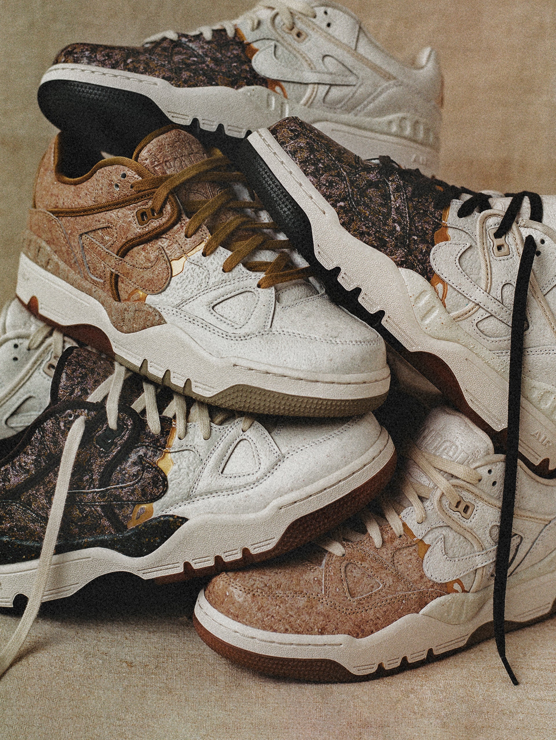 일본의 유명 패션 디자이너 니고가 전설적인 에어 포스 3에 예술적 감각을 불어넣었습니다. 옻칠과 귀금속 가루로 깨진 도자기를 수리하는 일본의 전통 기법 킨츠기에서 영감을 받은 그는 도예의 세계를 스니커즈에 녹여 이제껏 본 적 없는 새로운 방식을 선보입니다. 텍스처 처리된 가죽은 도자기의 표면과 감촉을 재현하고, 음각 처리된 금색 분할선은 킨츠기의 미학을 상징합니다. 비대칭 블로킹과 분할된 컬러 미드솔은 깨진 부분을 이어 붙인 듯한 디자인으로 그 테마를 이어갑니다.