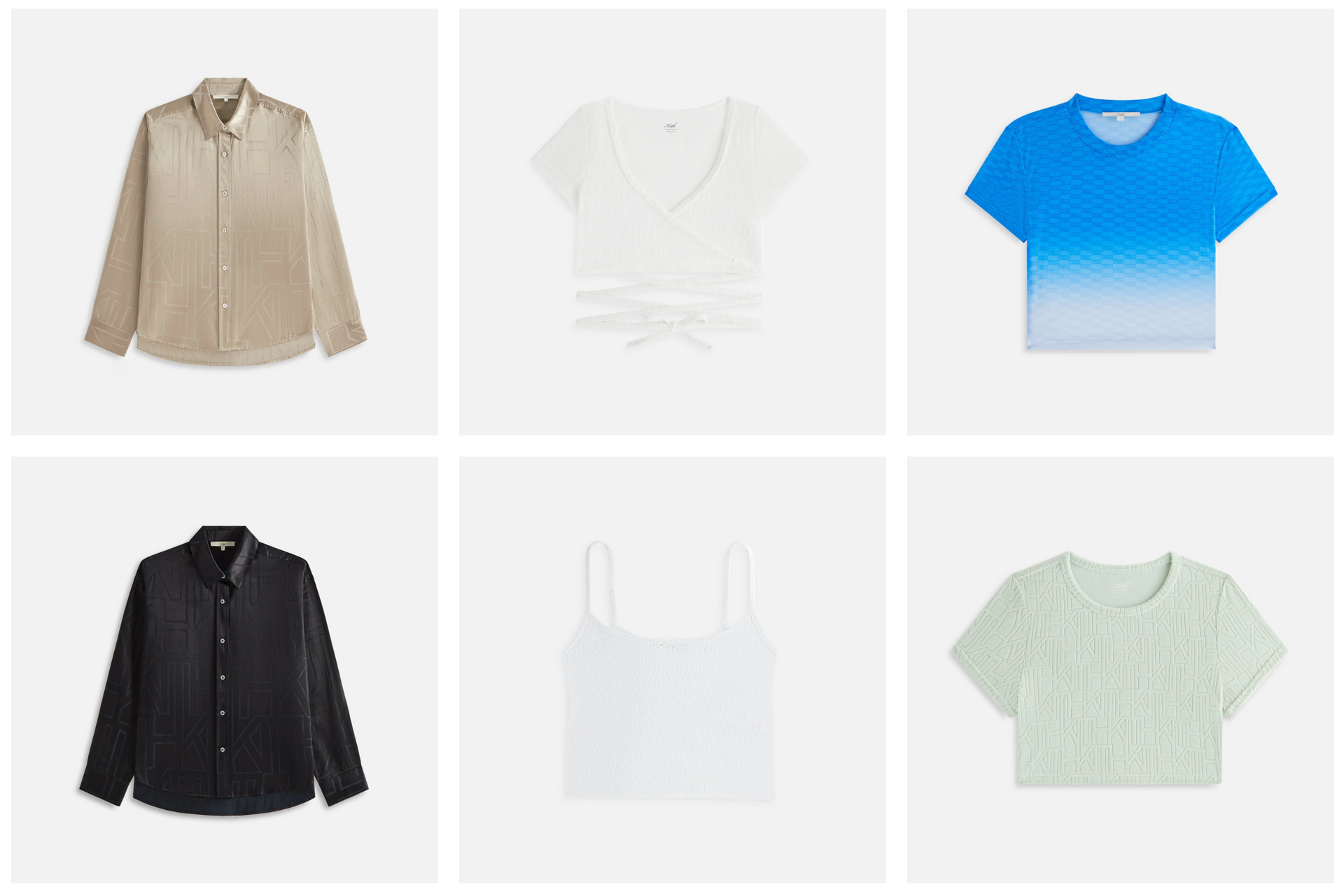 Kith Stacked 모노그램 프린트가 고급스러운 로앤 셔츠부터 여유로운 에일리 탑까지 다양한 스타일에 입혀졌습니다. 새틴, 테리, 폴리에스터 원단이 컬렉션 전체적으로 들어갔습니다.
