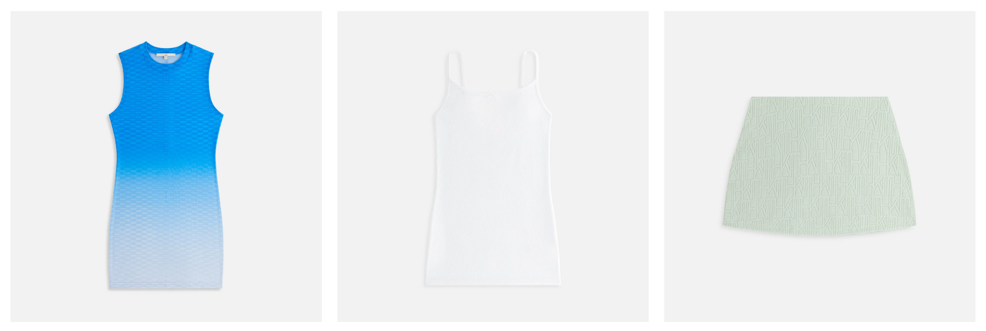 Kith Women의 시그니처 실루엣인 카딘 카미 드레스와 루미 맥시 커버업이 이번 시즌엔 계절별 모노그램 디자인과 솔리드 및 옴브레 버전으로 출시되었습니다. 베라 스커트는 프리미엄 테리로 제작되었으며 새로운 Kith Stacked 모노그램 디자인이 특징입니다.