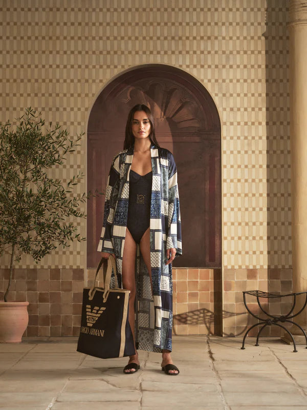 럭셔리 드레스, 기모노, 가운, 커버업 등이 이번 여성 컬렉션의 주요 아이템입니다. Giorgio Armani & Kith 기모노는 해머드 새틴 실크로 제작되었으며, 블루 톤의 정교한 패치워크 프린트와 은은한 코브랜드 모노그램 아트워크를 더합니다. 구조적인 칼라와 긴 와이드 소매, 허리를 감아 묶는 셀프 타이 벨트가 특징입니다. 실크 드레스는 고급스러운 비스코스-실크 혼방 소재로 제작되었으며, 톤온톤 페이즐리 패턴과 스위트하트 네크라인, 섬세한 백 스트랩으로 우아함을 완성합니다. 뒷면 허리에는 코브랜드 펜던트를 장식합니다. 커버업 드레스는 크로스오버와 딥 네크라인 실루엣으로 선보이며, 초경량 실크 혼방 소재로 제작해 고급스러운 디자인과 착용감을 모두 갖췄습니다. 마지막으로, 고급스러운 가운은 고급 레스토랑이나 저녁 모임에 적합한 아이템으로 제안합니다. 컬렉션의 마무리는 이탈리아와 미국의 휴양지를 담은 그래픽 티셔츠와 공동 브랜딩 하드웨어로 장식된 수영복으로 완성합니다.