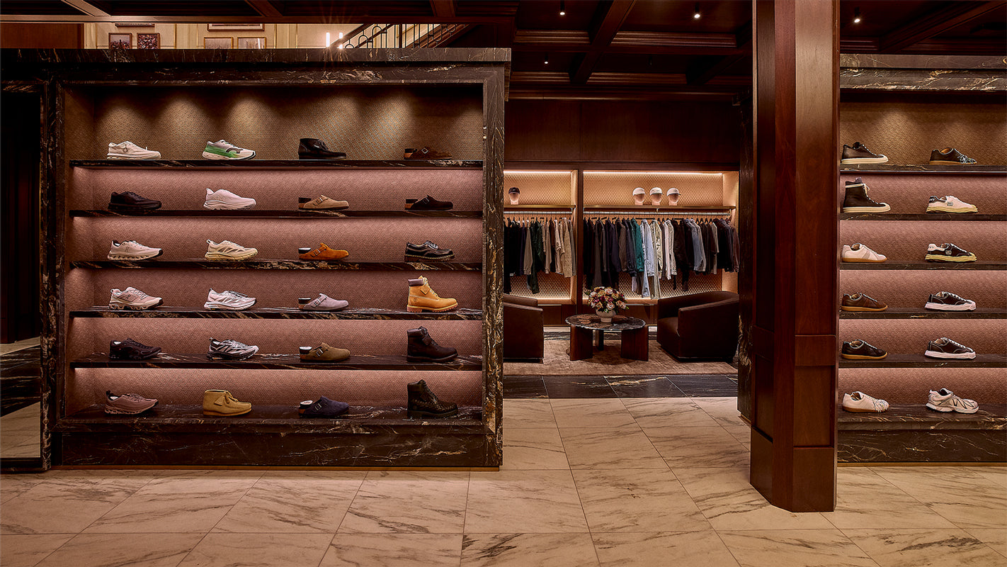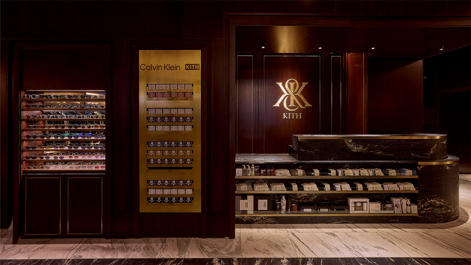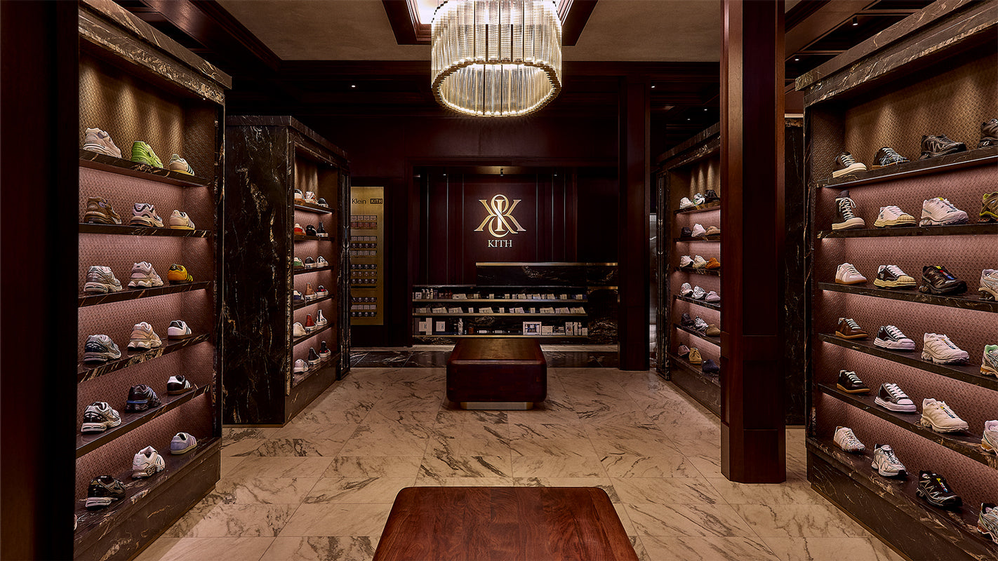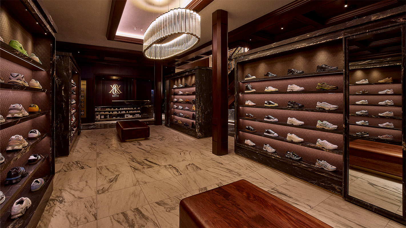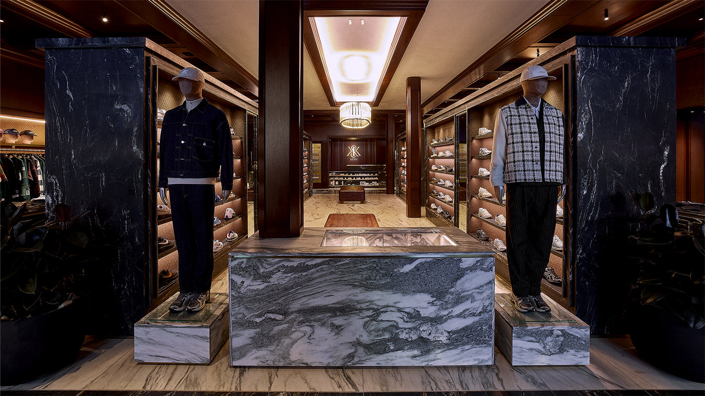 방문객들은 매장 1층에 들어서면 짙은 월넛 목재 마감재와 우물천장(Coffered ceiling)으로 둘러싸이게 되며, 이 공간에는 Kith와 다양한 브랜드의 제품들, 남성용 신발이 진열되어 있습니다. 바닥은 벨베데레(Belvedere) 석재 바닥에 몽클레어 댄비(Montclair Danby) 대리석으로 테두리 처리 되었으며, 의류 진열 공간은 K&K 크레스트 문양이 새겨진 맞춤형 벨벳과 가죽 벽지로 마감되어 있습니다. 매장 중앙에는 Kith의 라이프스타일 액세서리와 주얼리를 전시한 모놀리식 벨베데레 진열장이 배치되어 있습니다. 그 반대편에는 맞춤 제작 된 Mark Jupiter 호두 나무 벤치와 함께 남성용 신발이 진열되어 있습니다.