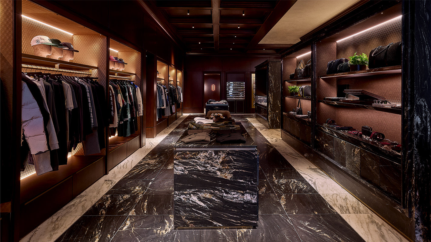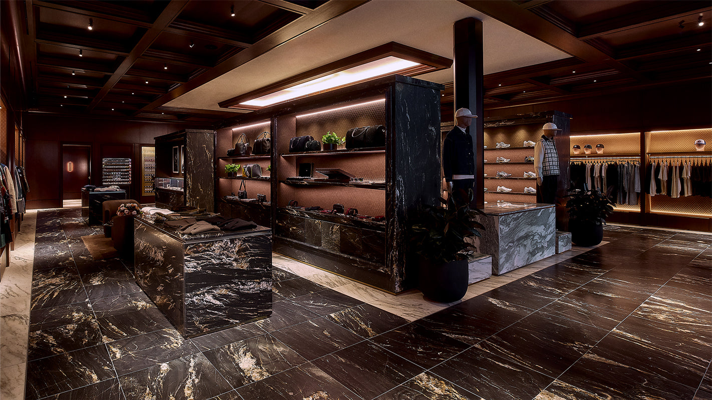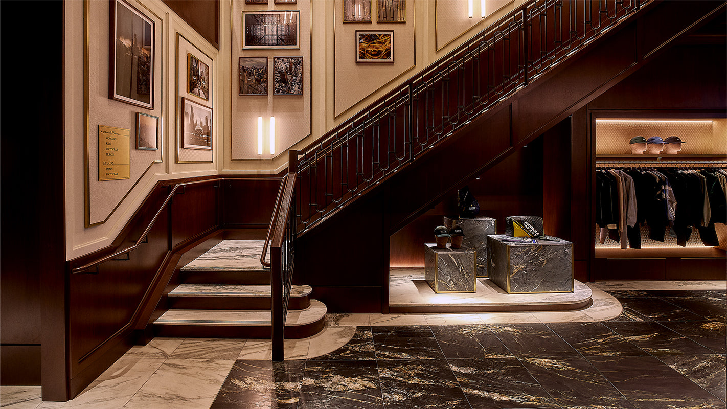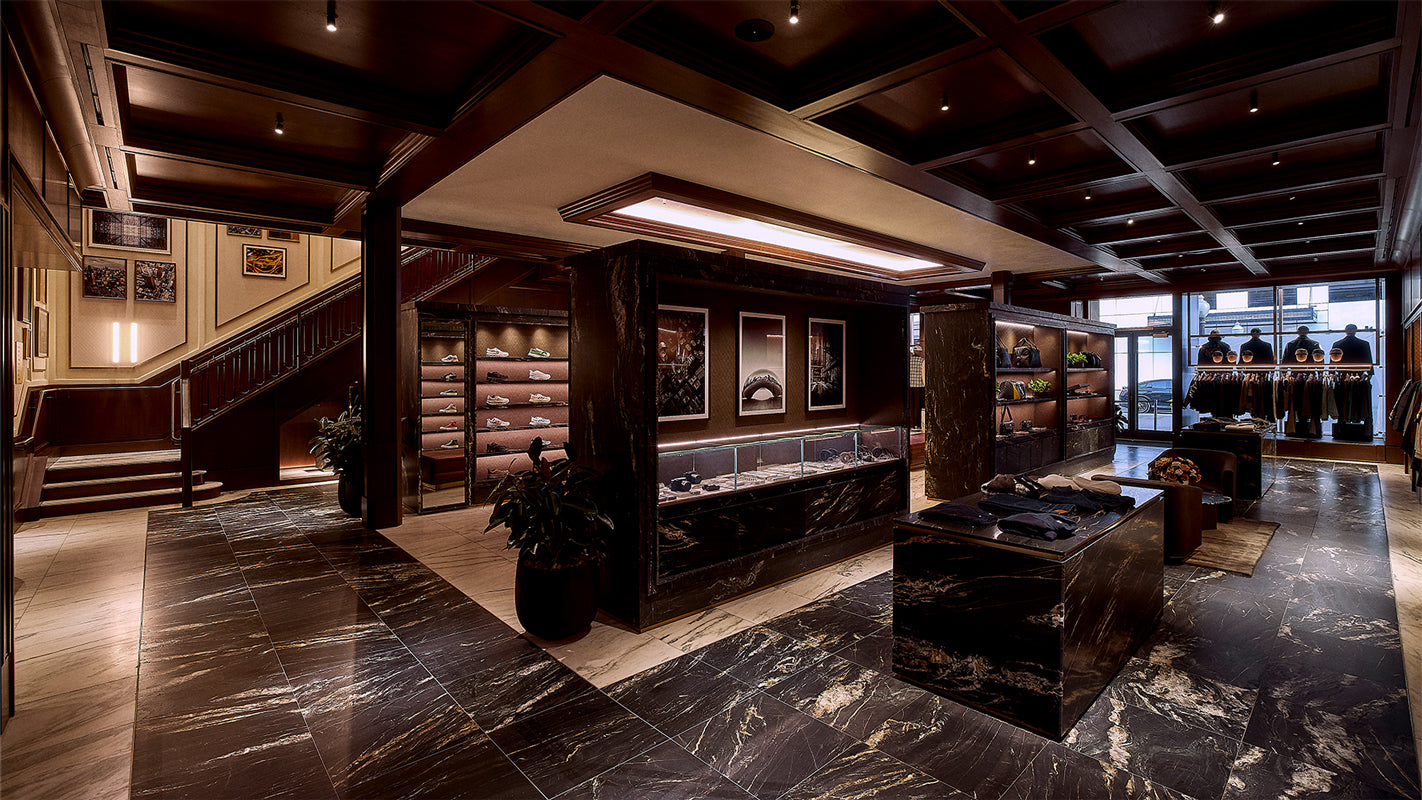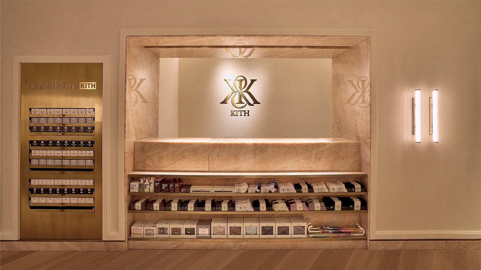 방문객들은 매장 1층에 들어서면 짙은 월넛 목재 마감재와 우물천장(Coffered ceiling)으로 둘러싸이게 되며, 이 공간에는 Kith와 다양한 브랜드의 제품들, 남성용 신발이 진열되어 있습니다. 바닥은 벨베데레(Belvedere) 석재 바닥에 몽클레어 댄비(Montclair Danby) 대리석으로 테두리 처리 되었으며, 의류 진열 공간은 K&K 크레스트 문양이 새겨진 맞춤형 벨벳과 가죽 벽지로 마감되어 있습니다. 매장 중앙에는 Kith의 라이프스타일 액세서리와 주얼리를 전시한 모놀리식 벨베데레 진열장이 배치되어 있습니다. 그 반대편에는 맞춤 제작 된 Mark Jupiter 호두 나무 벤치와 함께 남성용 신발이 진열되어 있습니다.
