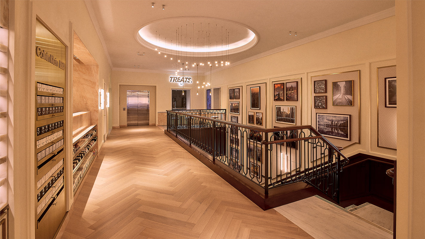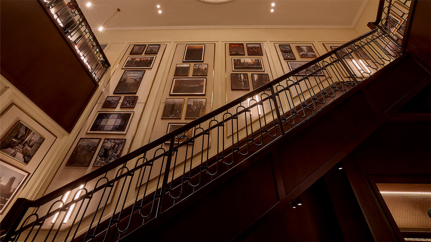 1층과 동일한 어두운 월넛과 몽클레어 댄비 대리석으로 마감된 인상적인 계단을 따라 2층의 메인 공간으로 올라가면, 따뜻한 환대의 분위기가 가장 강하게 느껴집니다. 특히, 석고 마감으로 부드럽게 처리된 대형 갤러리 벽은 맞춤형 K&K 벽지 패널과 어두운 월넛 웨인스코팅으로 꾸며져 있습니다. 이 갤러리 벽에는 시카고 기반 아티스트들이 촬영한 도시 풍경과 질감을 담은 사진 30여 점이 전시되어 있습니다.