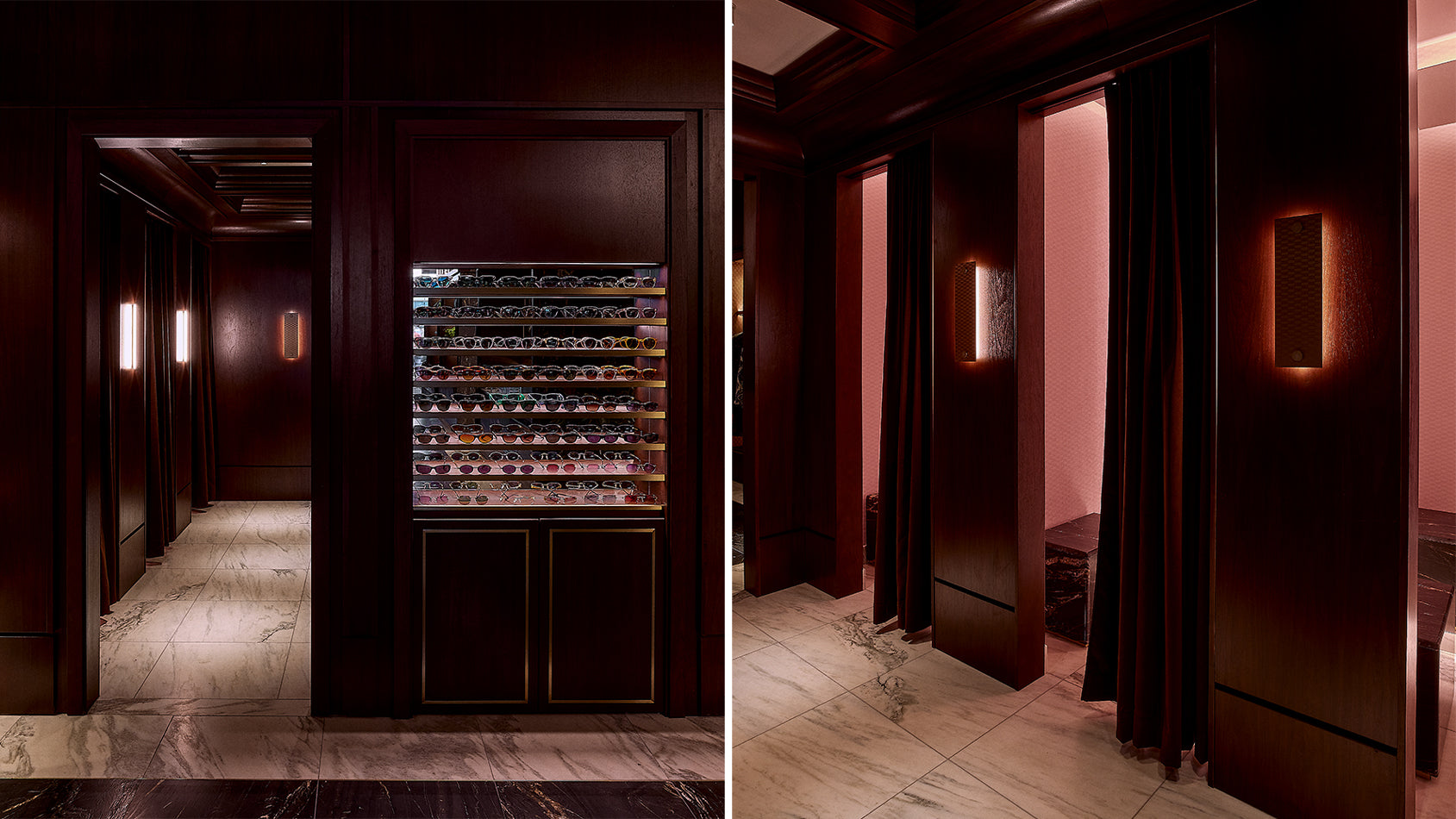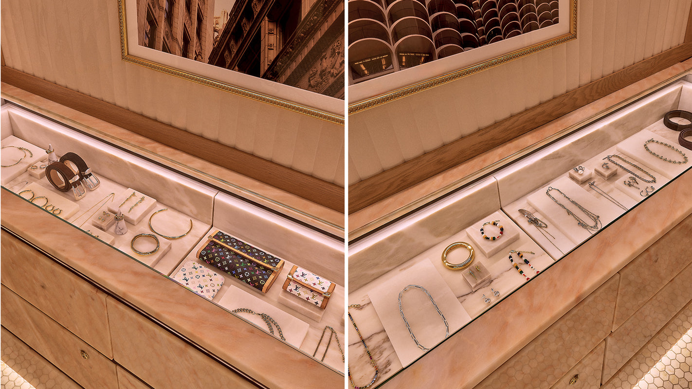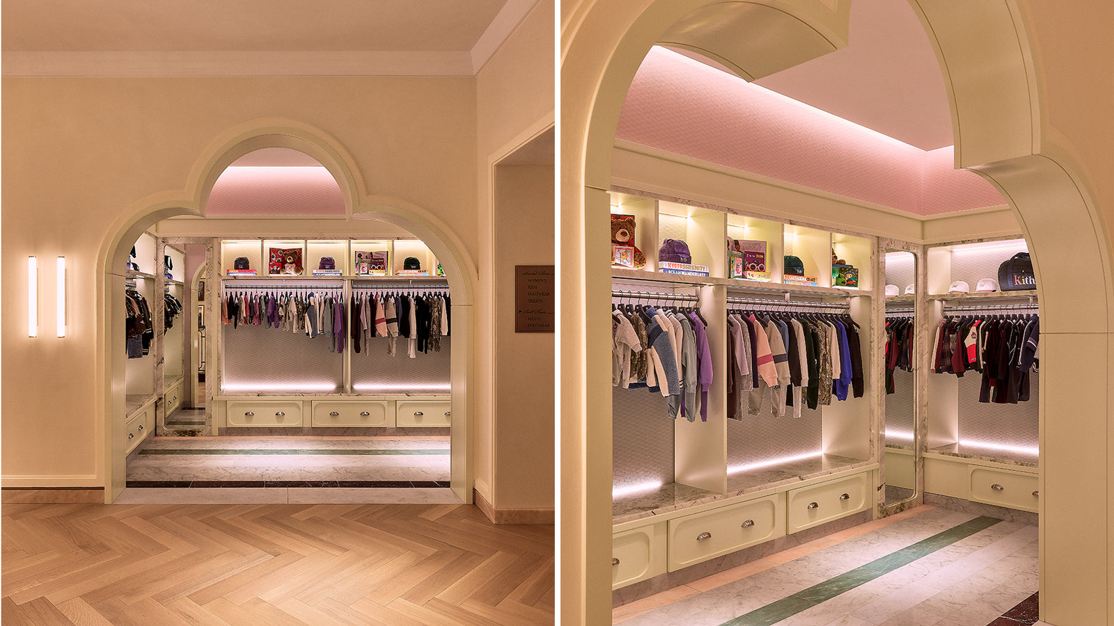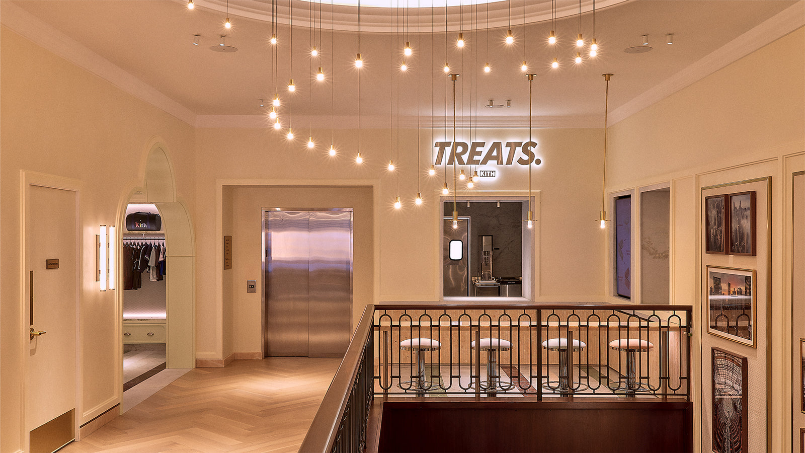 여성 액세서리 룸은 아늑하고 부드러운 분위기의 공간으로, 퀼팅 벽지, 맞춤형 로사 아우로라 마키아 베키아 대리석 주얼리 진열장 및 핸드백 디스플레이, 모자이크 타일 바닥으로 구성되어 있습니다. 매장 곳곳에는 이처럼 아늑한 공간이 더 있으며, 키즈룸도 그중 하나입니다. 키즈룸은 시그니처 클라우드 모티프 아치와 다채로운 석재 바닥으로 구분됩니다. 마지막으로 Kith Treats는 매장 맞은편에 별도의 좌석 공간과 함께 마련되어 있어, 쇼핑을 마친 후 잠시 쉬어가며 매장을 감상하기에 완벽한 공간입니다.