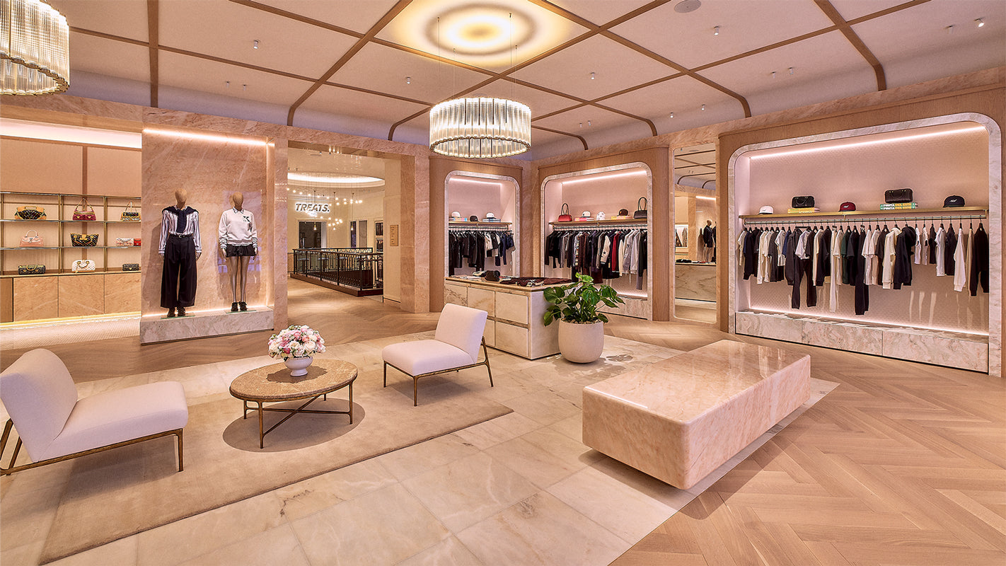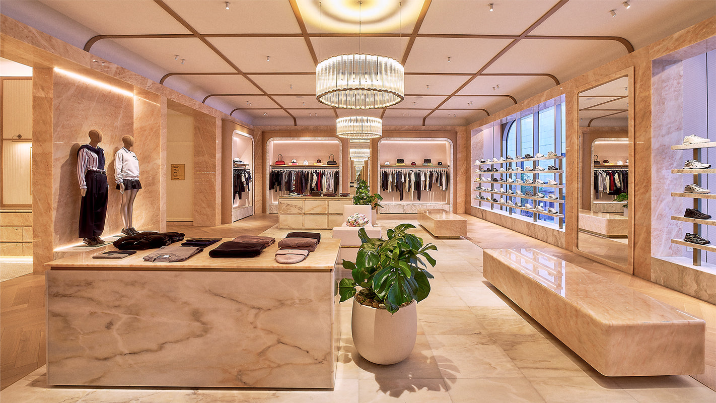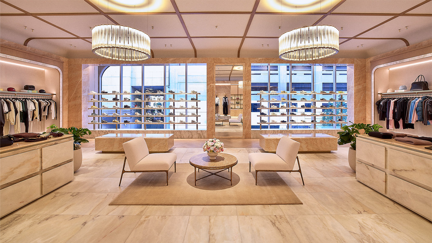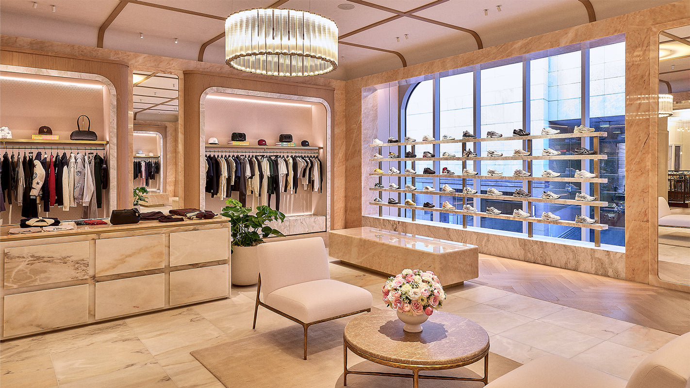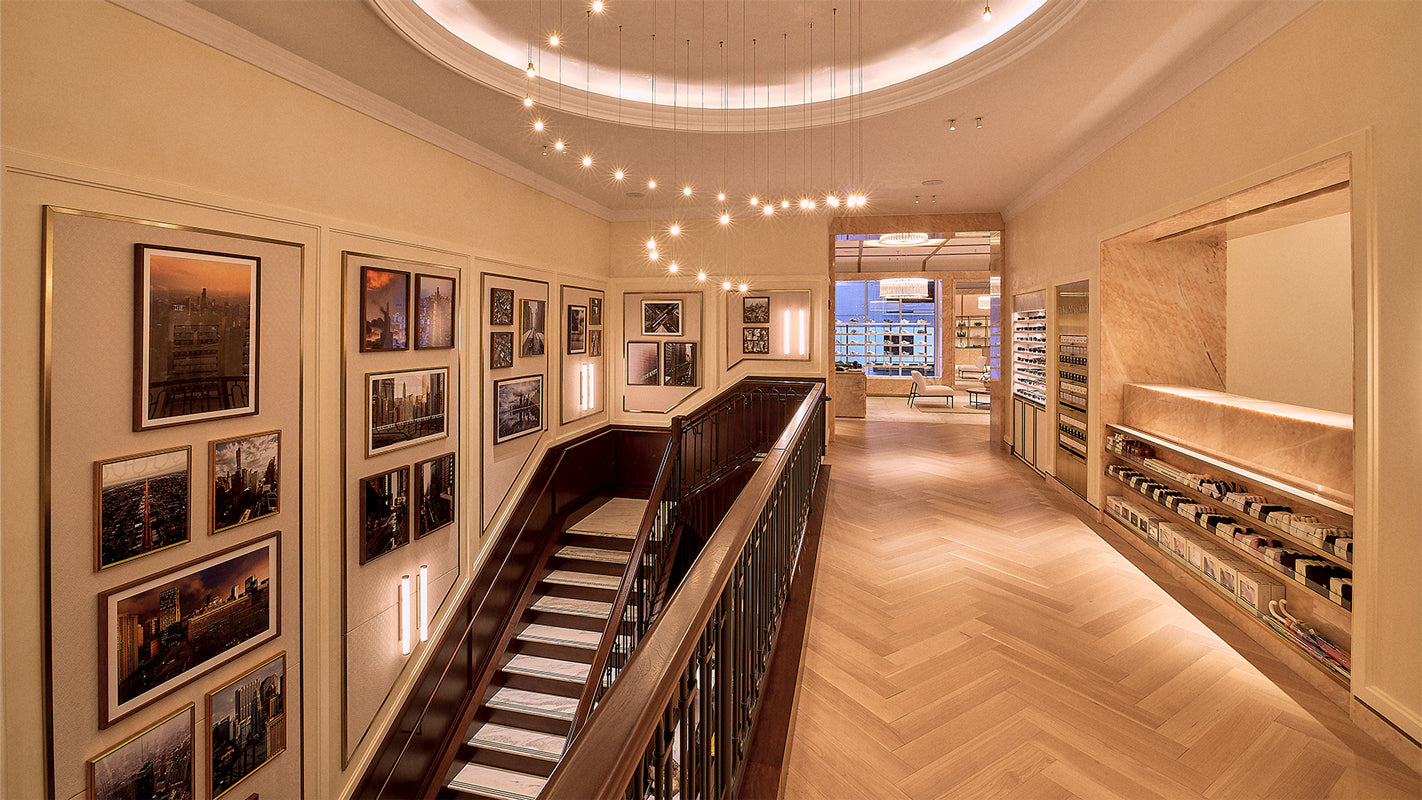 2층은 Kith Women, 여성 브랜드 제품, 여성용 신발, 그리고 Kith Kids를 위한 공간으로, 1층의 남성 공간과 대비되는 밝은 분위기를 자아냅니다. 계단을 오르면 눈에 띄는 것은 30개 이상의 펜던트가 나선형 형태로 배열된 맞춤형 샹들리에로, 여성의 공간에 들어가는 방문객에게 새로운 감동을 선사합니다. 천장은 오크로 트리밍 처리된 라임 워시 마감, 벽은 로사 아우로라 마키아 베키아 대리석으로 덮여 있으며, 바닥은 오크 헤링본 밴드가 삽입된 로사 아우로라 마블로 마감되어 있습니다. 매장 주변의 의류 진열 공간은 맞춤형 오크 목재로 제작되었으며, 베르데 재스민 대리석 프레임으로 장식되어 있습니다. 매장의 커다란 쇼윈도우 앞에는 여성용 신발이 진열되어 있으며, 그 반대편에는 여성 핸드백과 액세서리를 위한 전용 공간이 마련되어 있습니다.