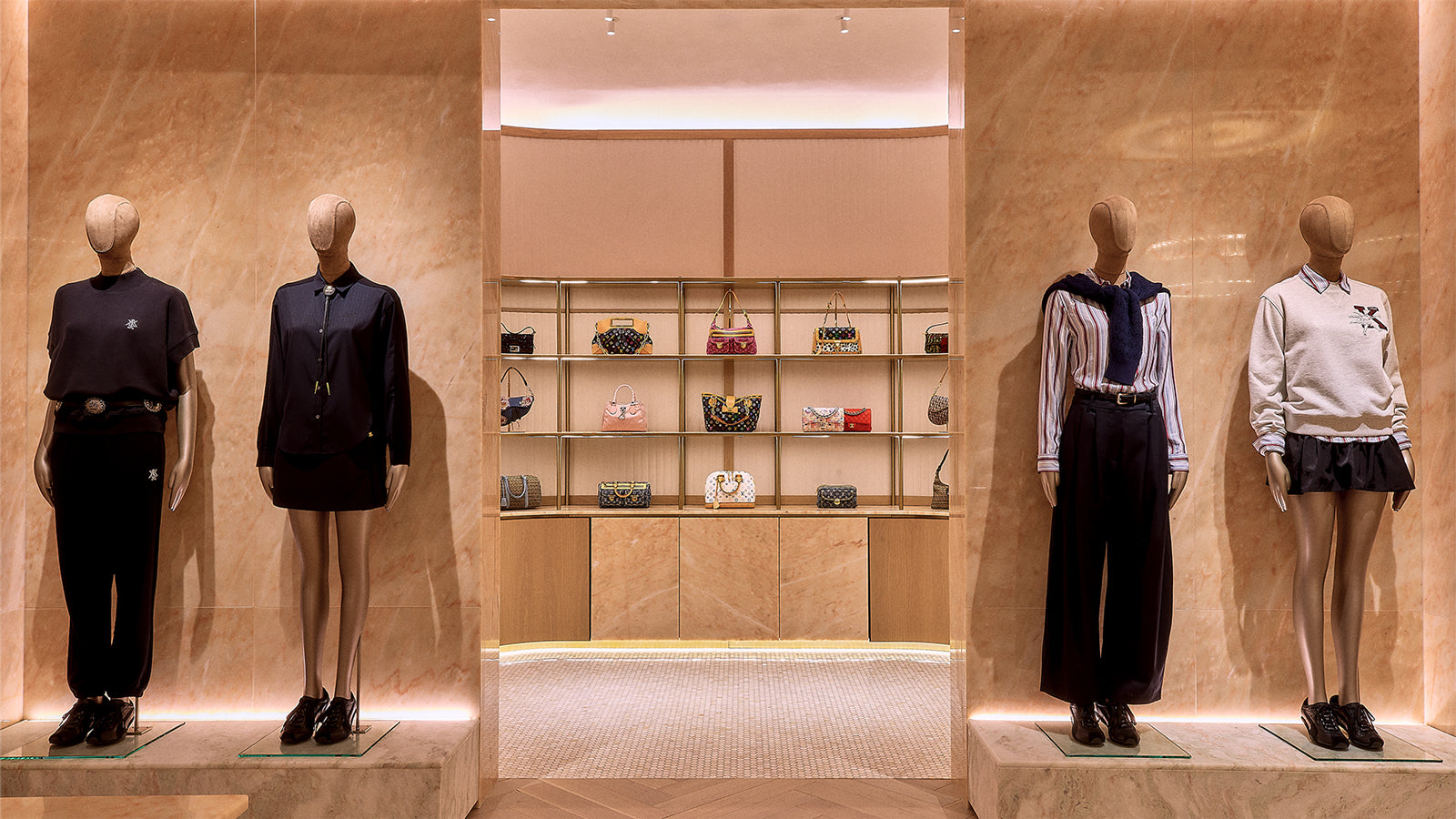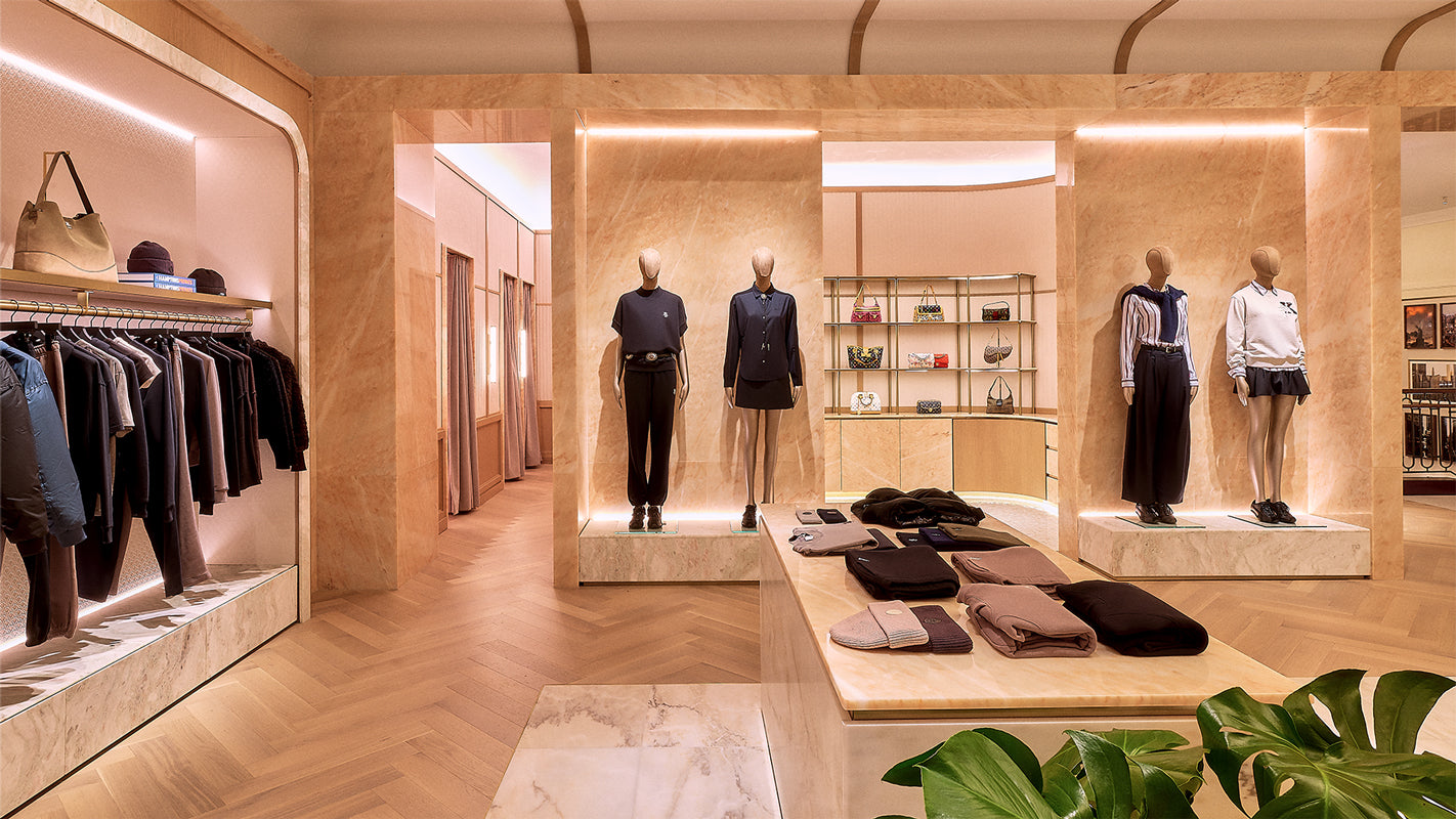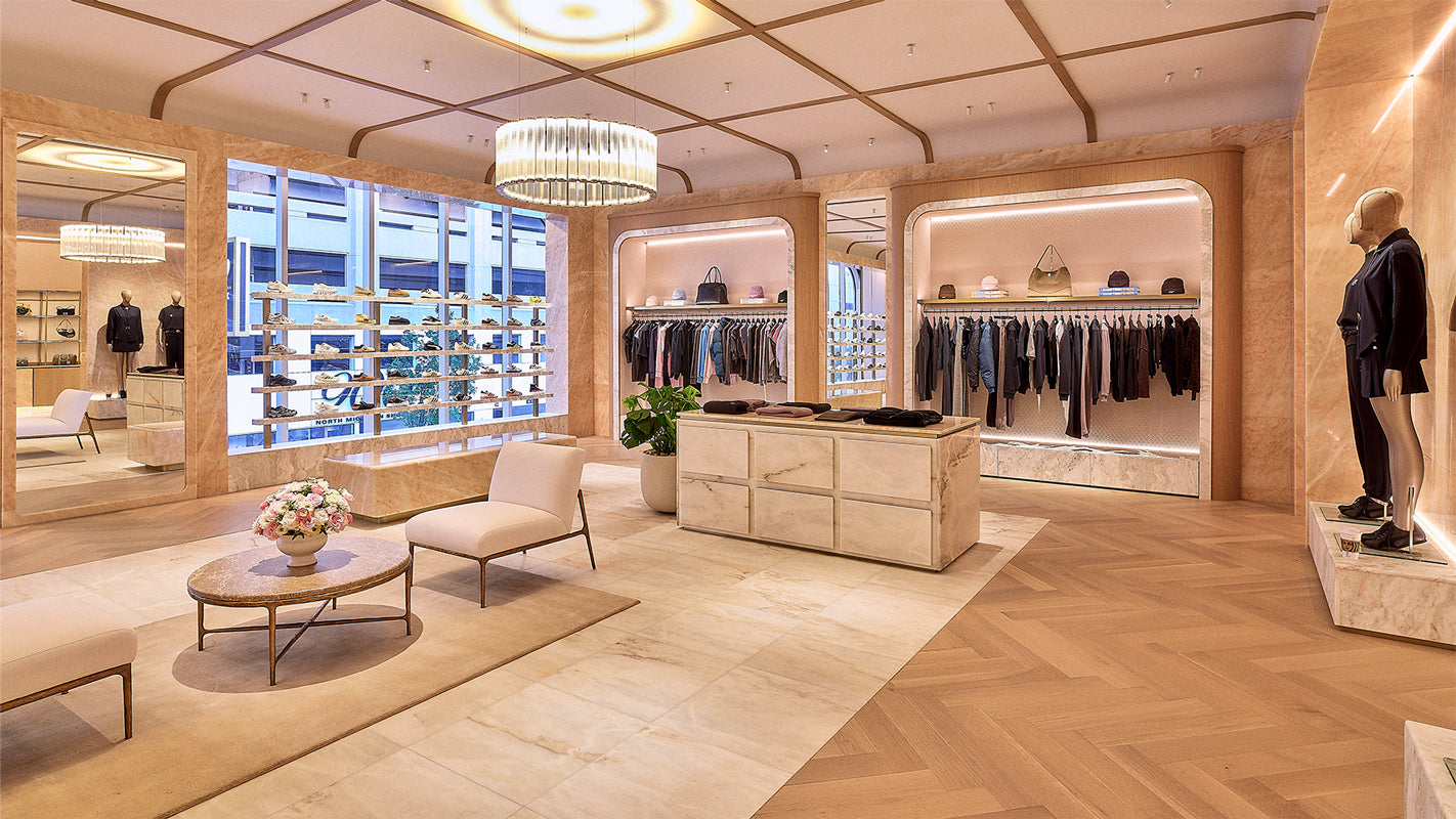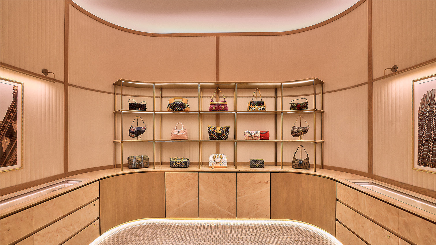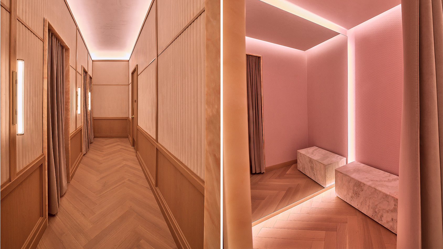 2층은 Kith Women, 여성 브랜드 제품, 여성용 신발, 그리고 Kith Kids를 위한 공간으로, 1층의 남성 공간과 대비되는 밝은 분위기를 자아냅니다. 계단을 오르면 눈에 띄는 것은 30개 이상의 펜던트가 나선형 형태로 배열된 맞춤형 샹들리에로, 여성의 공간에 들어가는 방문객에게 새로운 감동을 선사합니다. 천장은 오크로 트리밍 처리된 라임 워시 마감, 벽은 로사 아우로라 마키아 베키아 대리석으로 덮여 있으며, 바닥은 오크 헤링본 밴드가 삽입된 로사 아우로라 마블로 마감되어 있습니다. 매장 주변의 의류 진열 공간은 맞춤형 오크 목재로 제작되었으며, 베르데 재스민 대리석 프레임으로 장식되어 있습니다. 매장의 커다란 쇼윈도우 앞에는 여성용 신발이 진열되어 있으며, 그 반대편에는 여성 핸드백과 액세서리를 위한 전용 공간이 마련되어 있습니다.