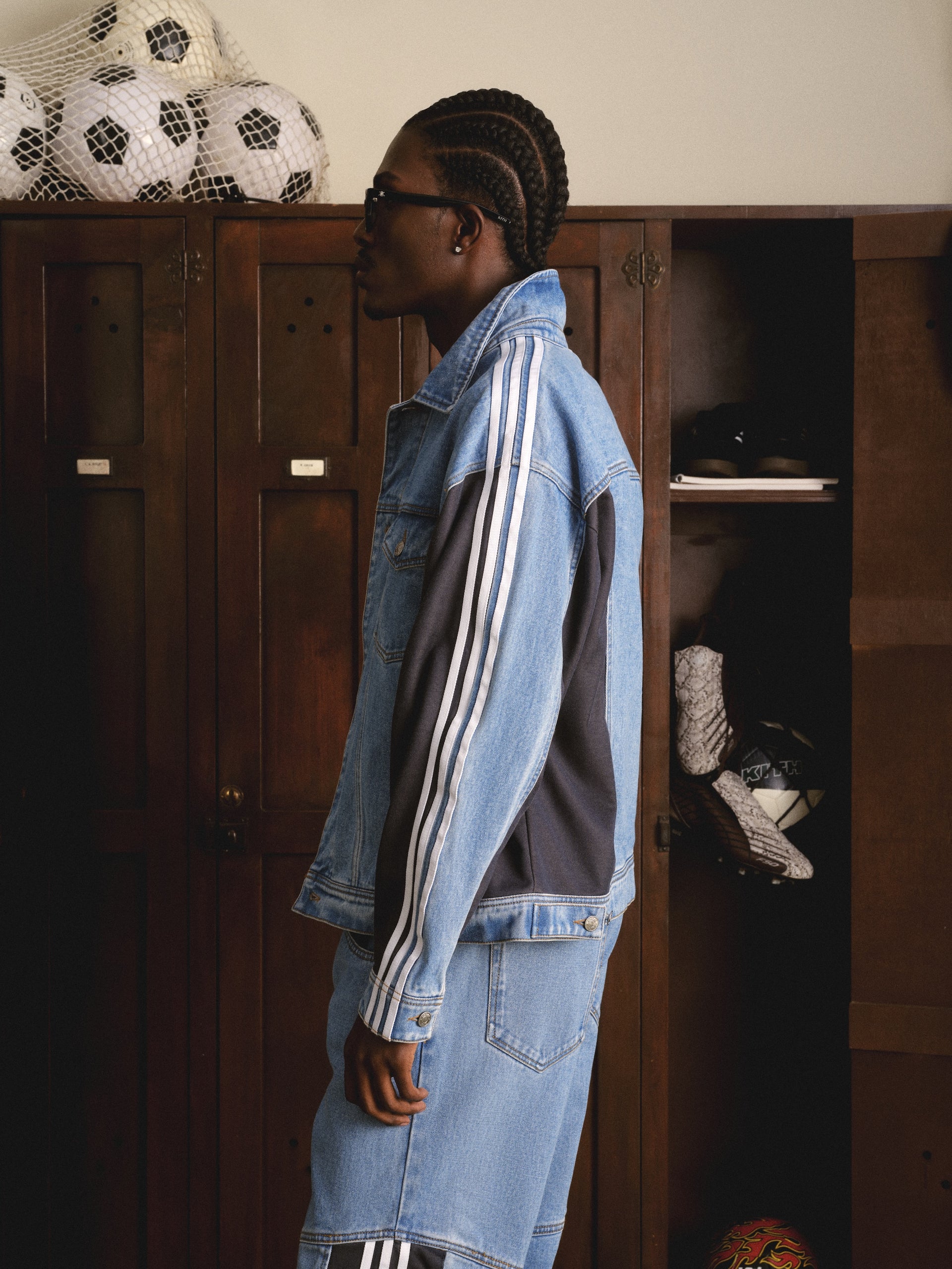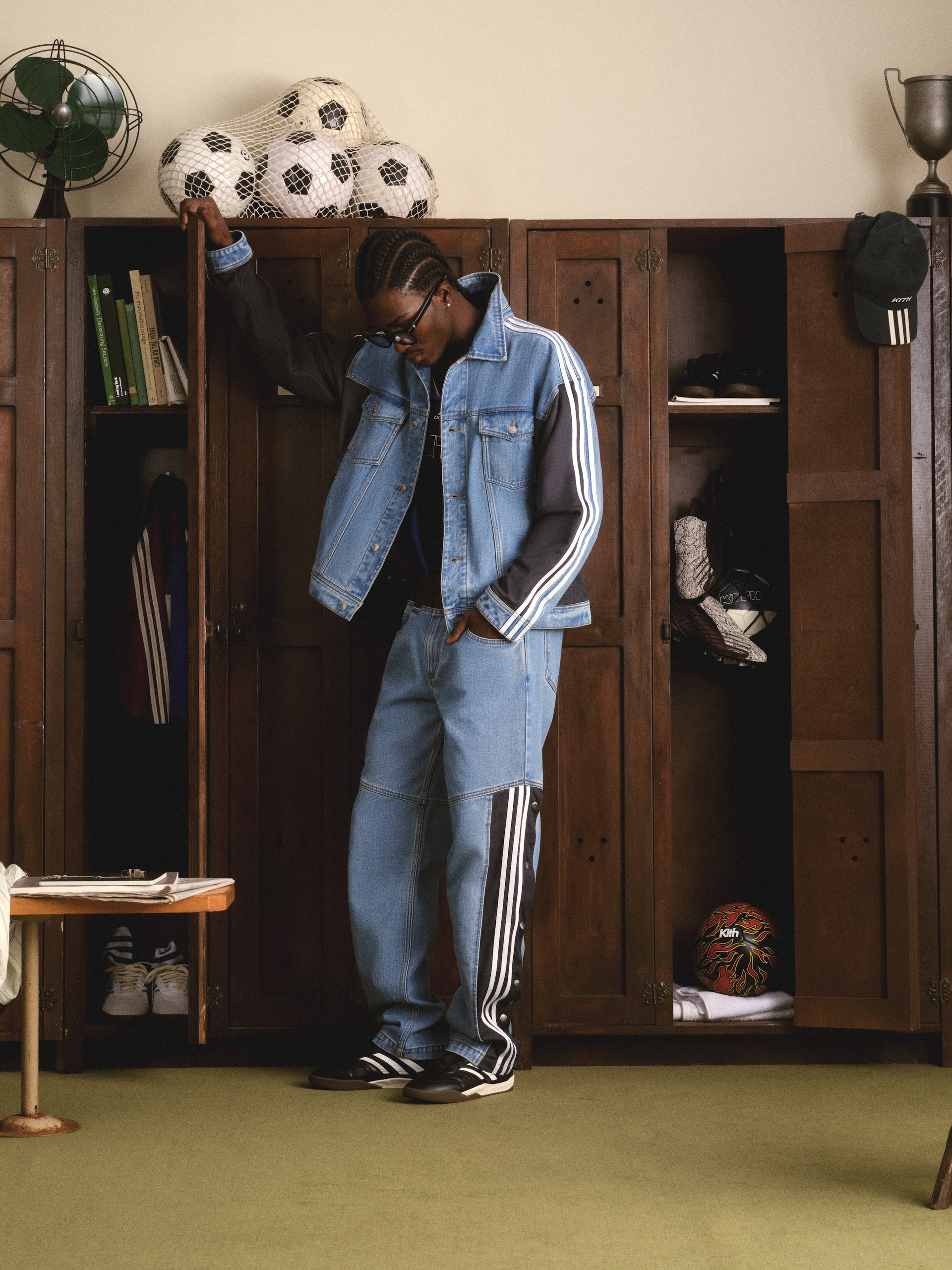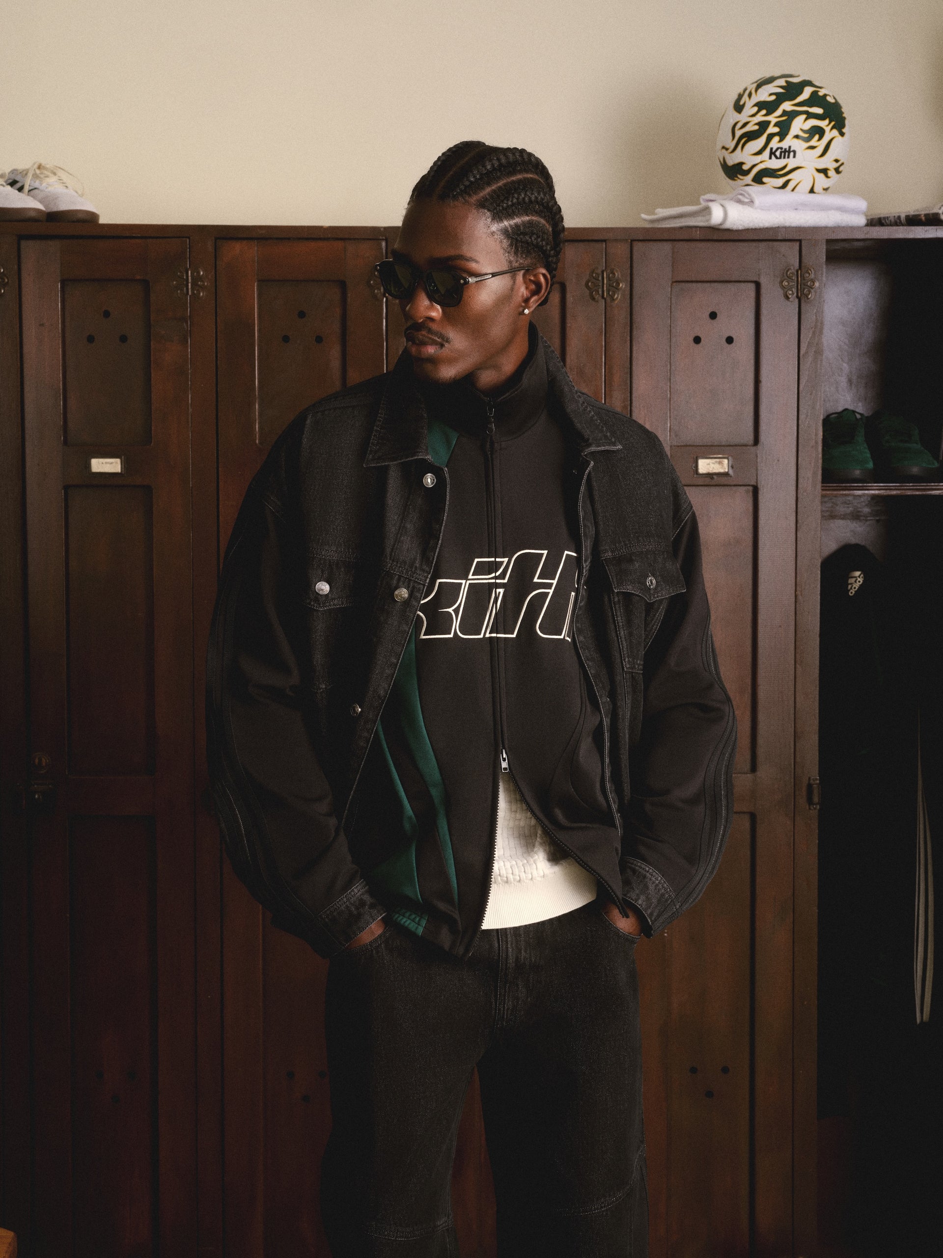 이번 컬렉션에서 주목할 만한 의류 아이템에는는 데님 재킷과 팬츠가 포함되어 있으며, 블루와 블랙 워시로 제작되어 스포츠적인 요소가 더해졌습니다. 팬츠에는 브레이크어웨이 기능을 위한 Adi-break 패널이 적용되었고, 재킷에는 겨드랑이와 허리 밴드 부분에 대비되는 퍼포먼스 원단이 사용되었습니다. 재킷과 팬츠 모두 삼선(Three Stripe) 오버레이, 샹크 클로저, 커스텀 가죽 패치가 더해져 완성되었습니다. 아우터웨어는 Kith의 클래식 실루엣들을 특징으로 하며, 링클 나일론, 모노그램 자카드, 인터록 혼방 원단으로 제작 된 Wyona 집업 스웨터, 새틴 소재의 Gorman 재킷, 그리고 숏슬리브 집업 저지로 구성되어 있습니다.