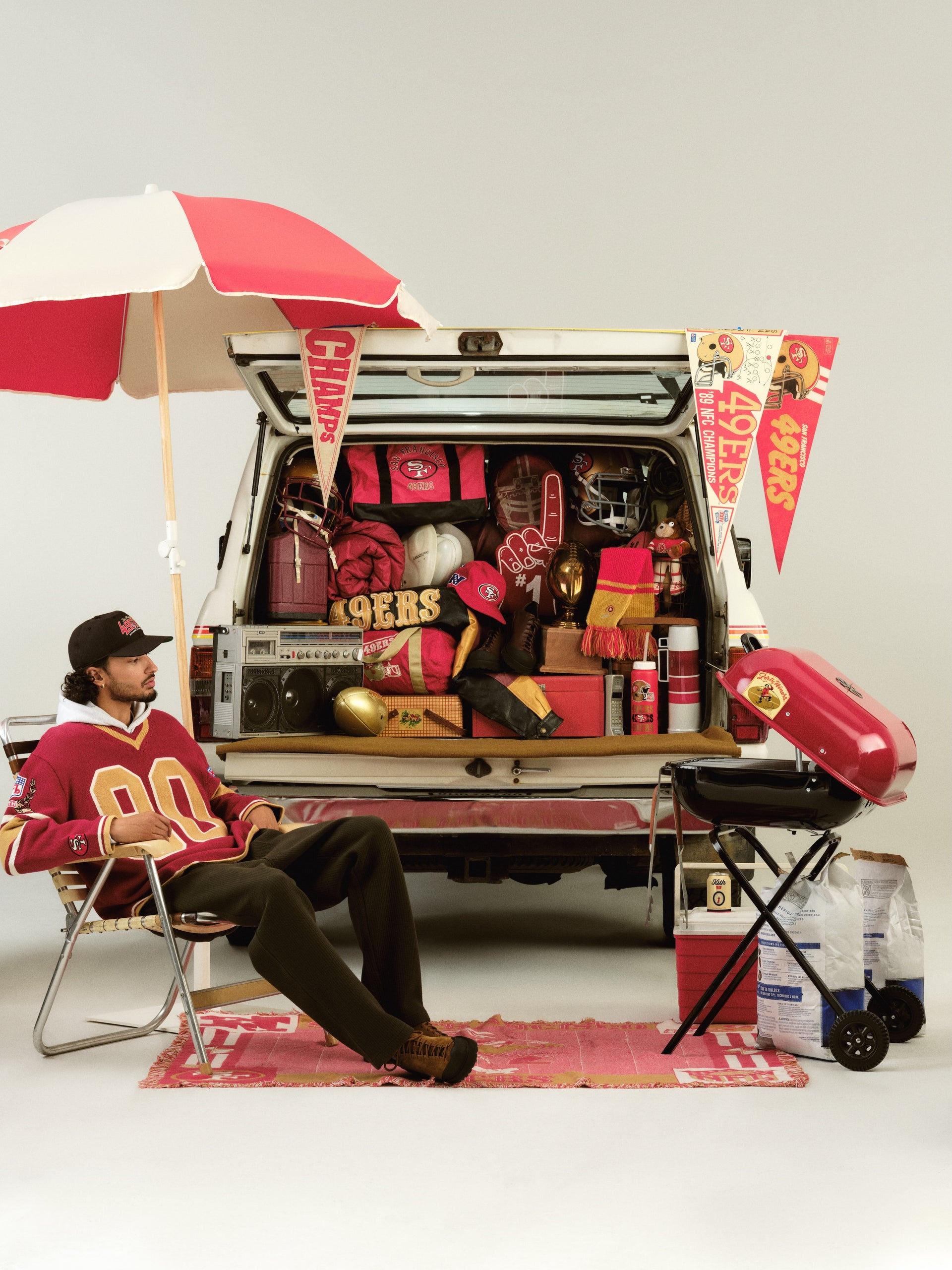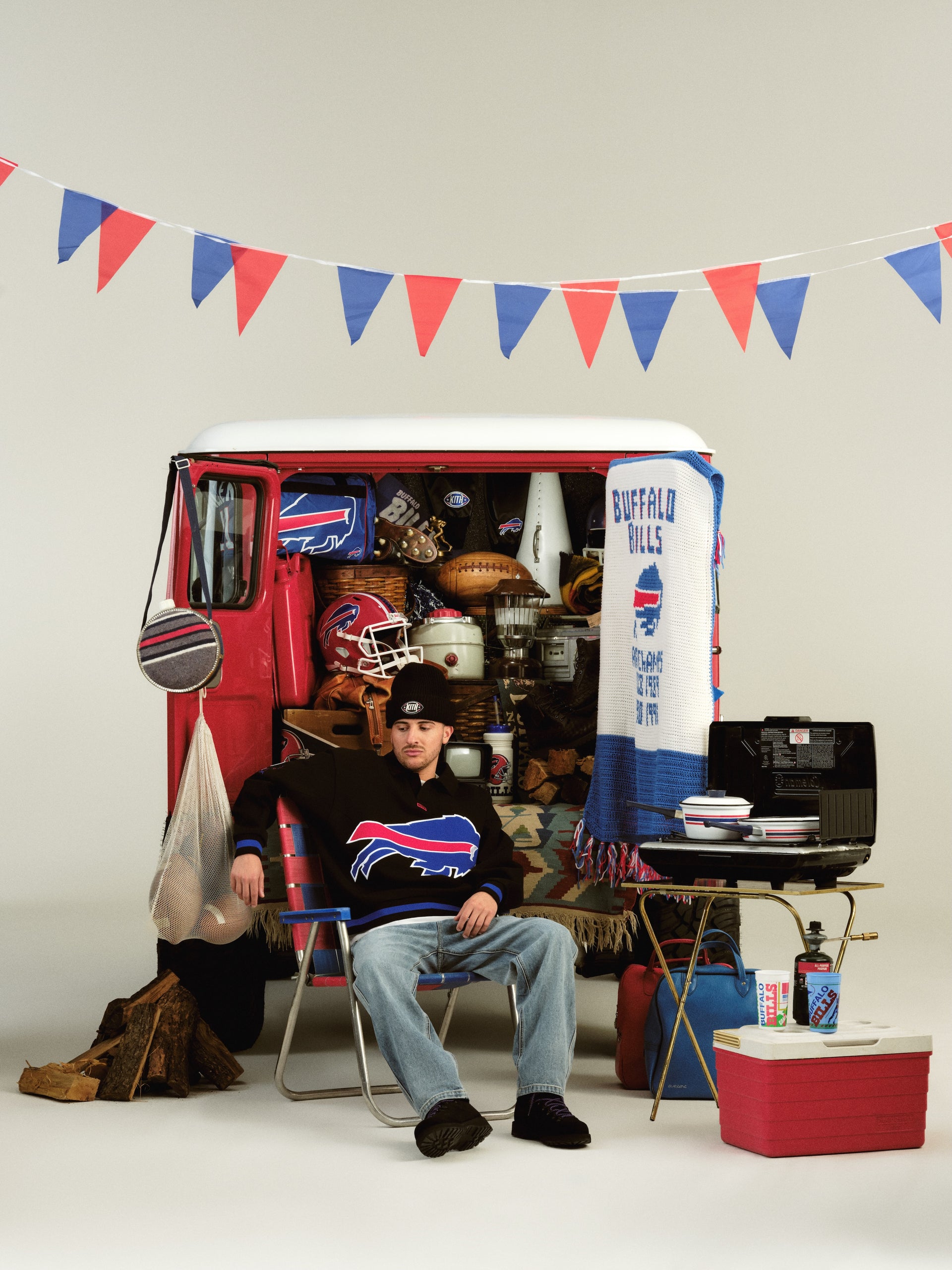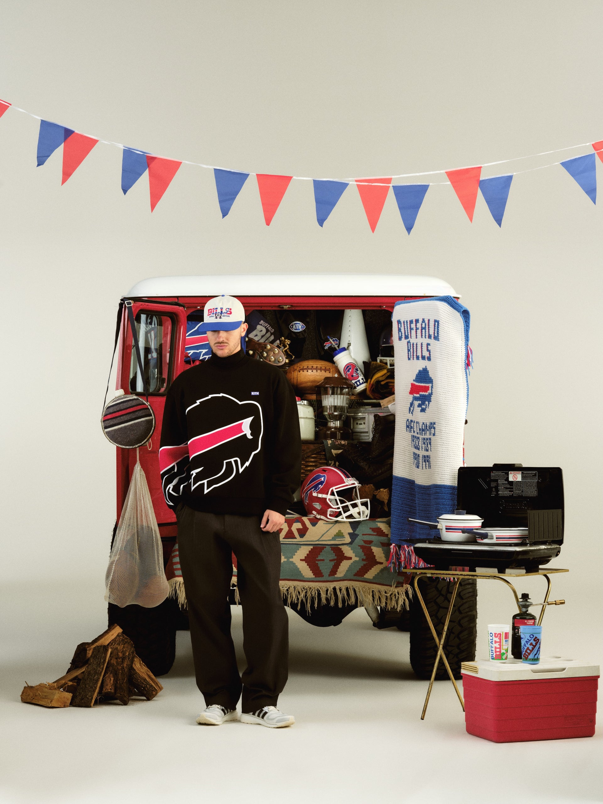 Kith for the NFL: Road to Victory 컬렉션은 ‘47 브랜드와 협업한 헤드웨어로 완성되며, Franchise LS와 트러커 햇 등 계절감 있는 울, 마이크로 스웨이드, 코듀로이 소재로 제작된 다양한 스타일이 포함됩니다.추운 날씨를 위한 실루엣으로는 자수 아트워크가 들어간 Mia Beanie, 전체 아트워크가 적용된 Hitch Trucker, 아플리케 패치가 포함된 제품들이 출시됩니다.