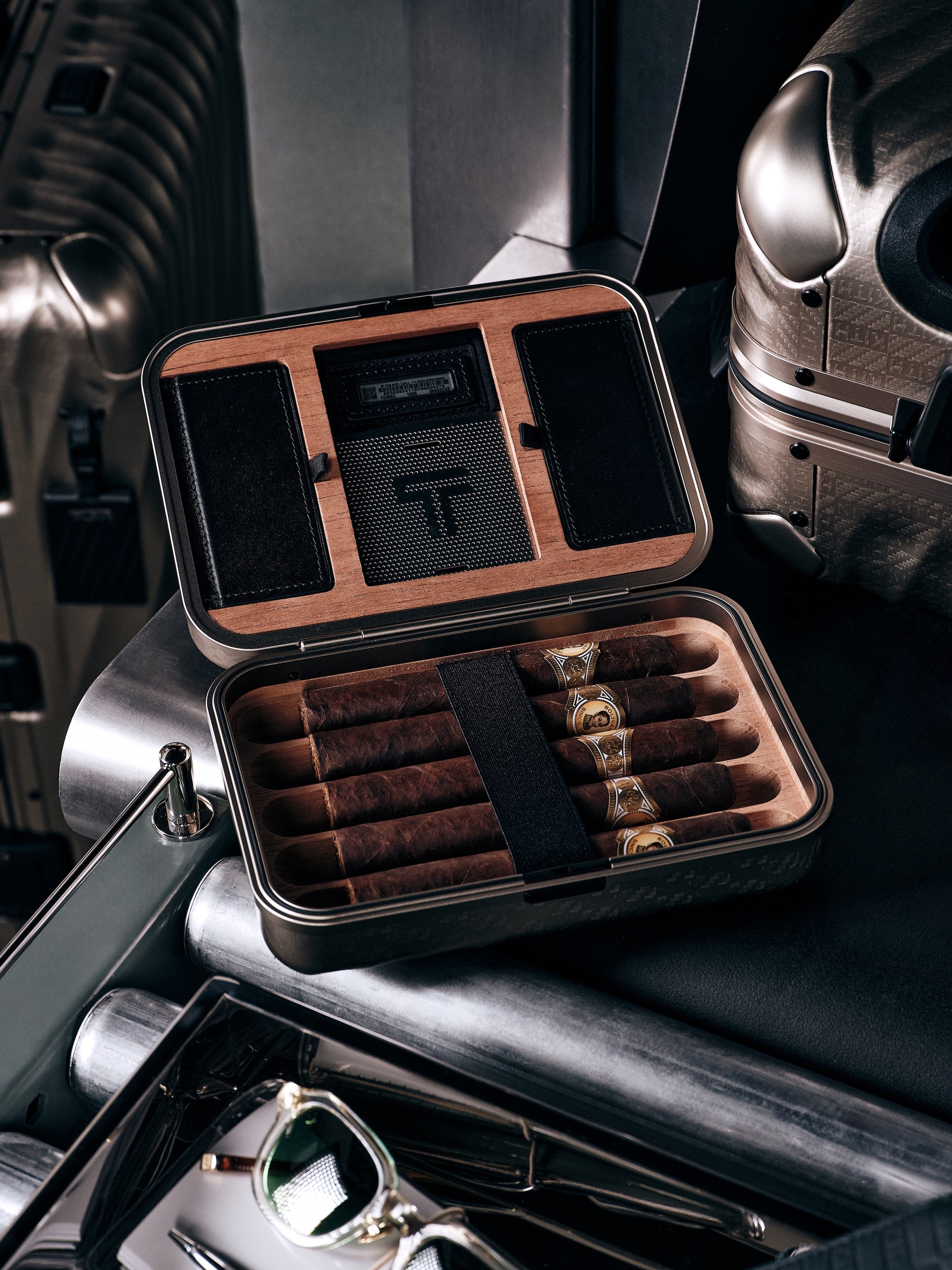 이번 컬렉션의 중심에는 여섯 가지 크기의 롤러 수트케이스가 있습니다. International Carry On부터 Short Trip, Extended Trip, Rolling Trunk까지 다양한 사이즈로 구성되어 있으며, 모두 TUMI의 항공기 등급 알루미늄 소재로 제작된 하드 케이스로, 19 Degree 디자인 특유의 곡선 라인과 톤온톤 Kith 모노그램이 적용되어 있습니다. 근거리와 장거리 여행 모두 상관없이 탁월한 내구성과 스타일을 동시에 제공하며, TSA 승인 듀얼 잠금장치, 정밀 프레임 시스템, 내부 디바이더, 행어 브래킷, 보호 범퍼 등 다양한 기능을 갖추고 있습니다. 또한 듀얼 스피닝 휠과 2단식 텔레스코픽 핸들이 장착되어 있어 부드러운 이동이 가능합니다. 작년 협업에서 선보였던 시가 케이스, 선글라스 케이스, 워치 케이스도 동일한 19 Degree 알루미늄 소재와 톤온톤 Kith 모노그램 디테일로 다시 제작되어 아이코닉한 디자인을 이어갑니다.
