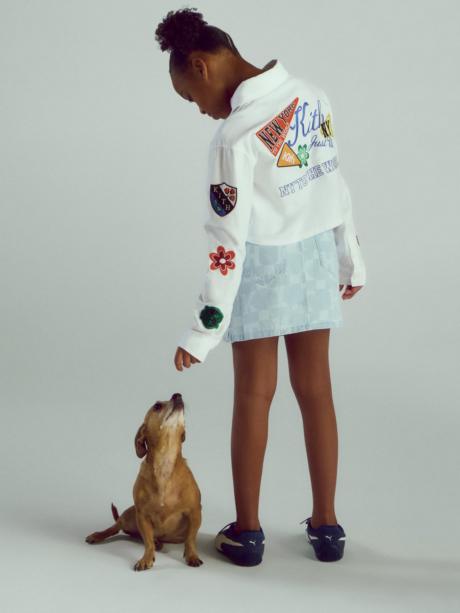 Kith Kids Spring 2026은 데님 카테고리를 확장하여 선보입니다. 새로운 실루엣인 Heston 와이드 레그 진을 비롯해, Kith 브랜딩이 전반에 적용된 데님 봄버 재킷과 모노그램 데님 스커트 세트, 기능성과 디자인을 겸비한 Milo 재킷과 트랙 팬츠 세트가 하이라이트 아이템으로 구성되어 있습니다. 또한 가벼운 레이어링에 적합한 아우터웨어도 함께 선보입니다. 기존 Kith 컬렉션에서 전개되었던 NY to the World 바시티 재킷을 키즈 사이즈로 새롭게 선보이며, 빈티지 무드의 셔닐 자수 아트워크를 이번 시즌 다양한 실루엣에 적용하였습니다. 해당 디테일은 NY to the World 카디건, 크롭드 Apollo 셔츠, 노벨티 Leon 저지 등에서 확인하실 수 있습니다.