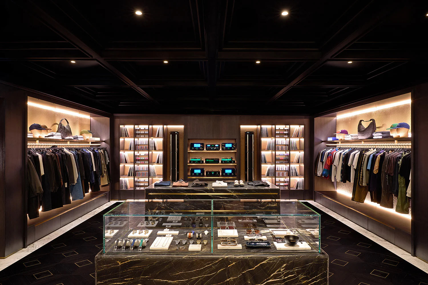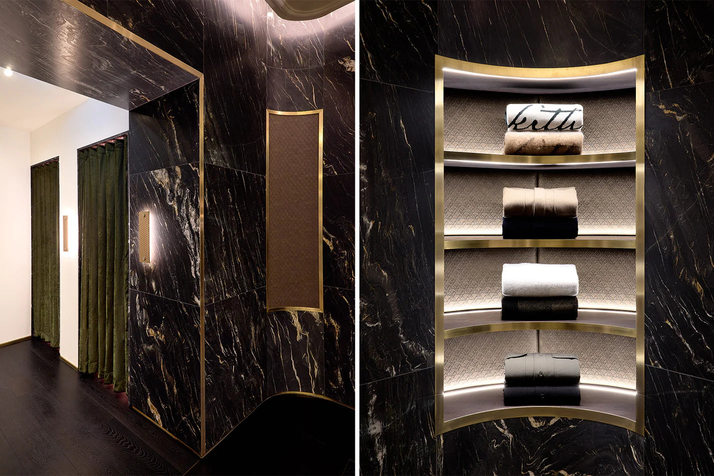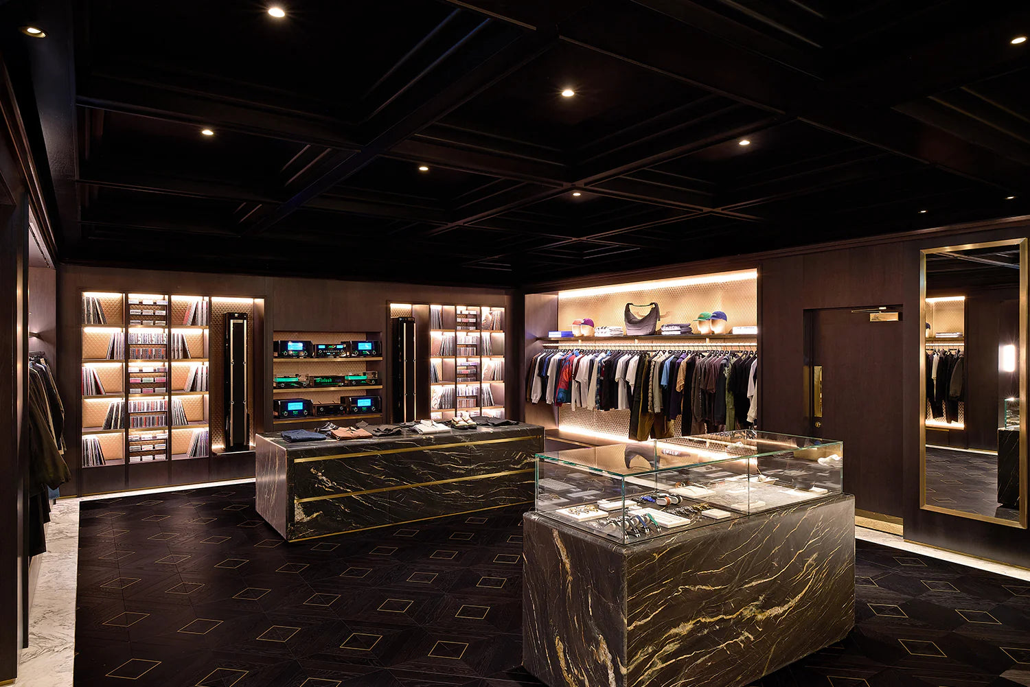 Kith Women 공간 오른편 체크아웃을 지나면 더욱 짙고 깊은 팔레트의 Kith 메인 공간이 이어집니다. 월넛 밀워크, Belvedere 대리석 벽, Calacatta Vagli 테이블, Kith 엠보싱 가죽, 다크 우드 헤링본 바닥, 녹색 벨벳 다이아몬드-터프트 포인트 등이 어우러져 넓은 공간 속에서도 아늑하고 고급스러운 분위기를 만듭니다. 이곳에서는 Kith의 시즌 컬렉션, 액세서리, 파인 주얼리, 콜라보레이션 제품뿐 아니라 런던 한정 상품도 판매됩니다.