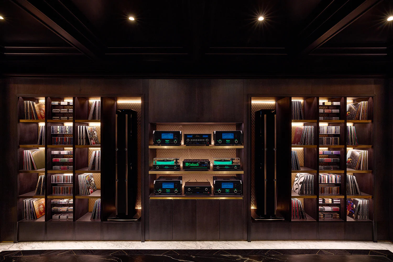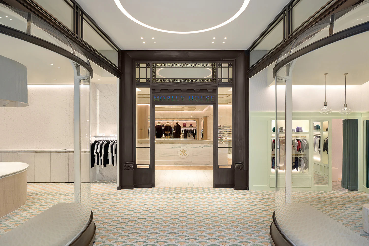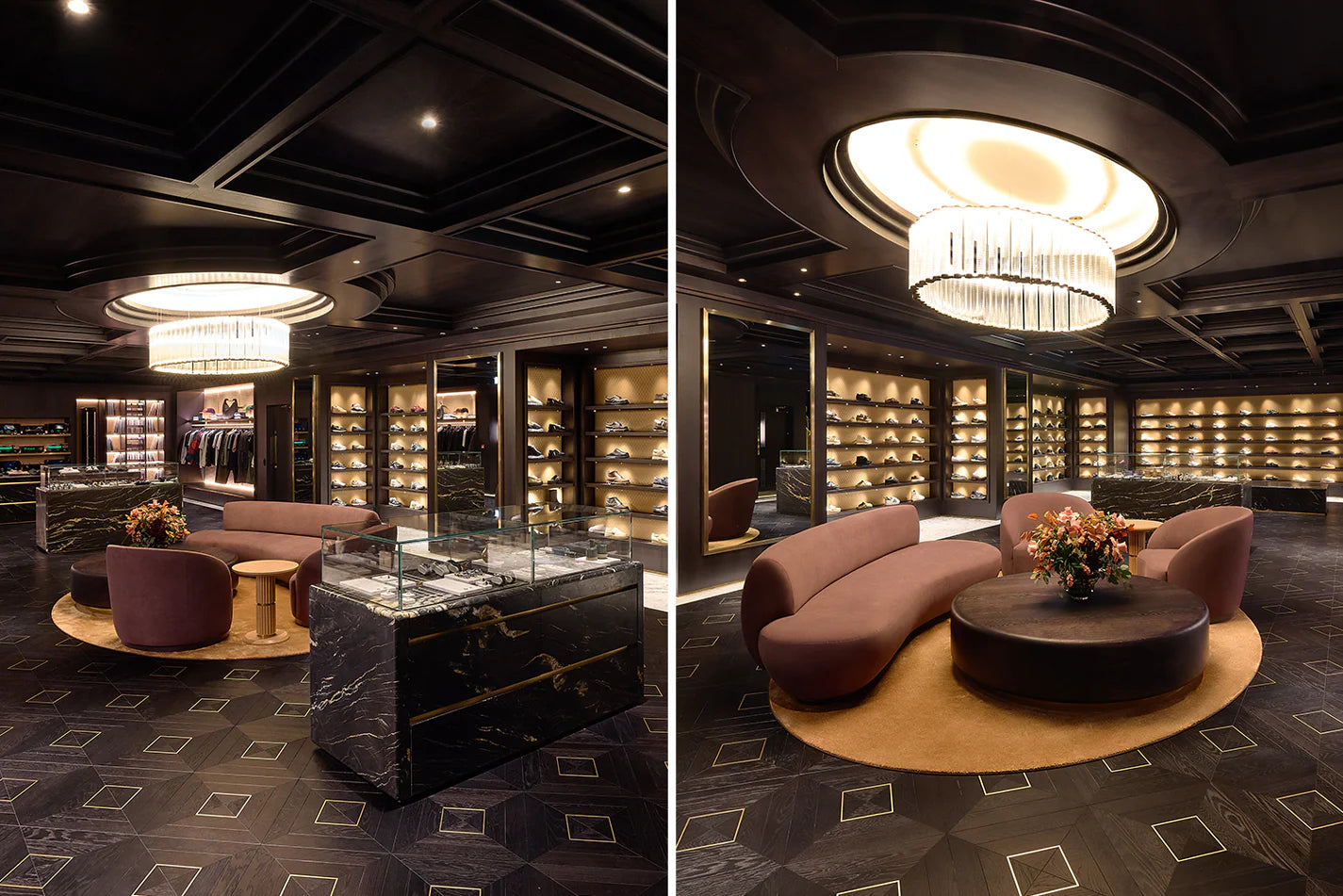 Kith Women 공간 오른편 체크아웃을 지나면 더욱 짙고 깊은 팔레트의 Kith 메인 공간이 이어집니다. 월넛 밀워크, Belvedere 대리석 벽, Calacatta Vagli 테이블, Kith 엠보싱 가죽, 다크 우드 헤링본 바닥, 녹색 벨벳 다이아몬드-터프트 포인트 등이 어우러져 넓은 공간 속에서도 아늑하고 고급스러운 분위기를 만듭니다. 이곳에서는 Kith의 시즌 컬렉션, 액세서리, 파인 주얼리, 콜라보레이션 제품뿐 아니라 런던 한정 상품도 판매됩니다.
