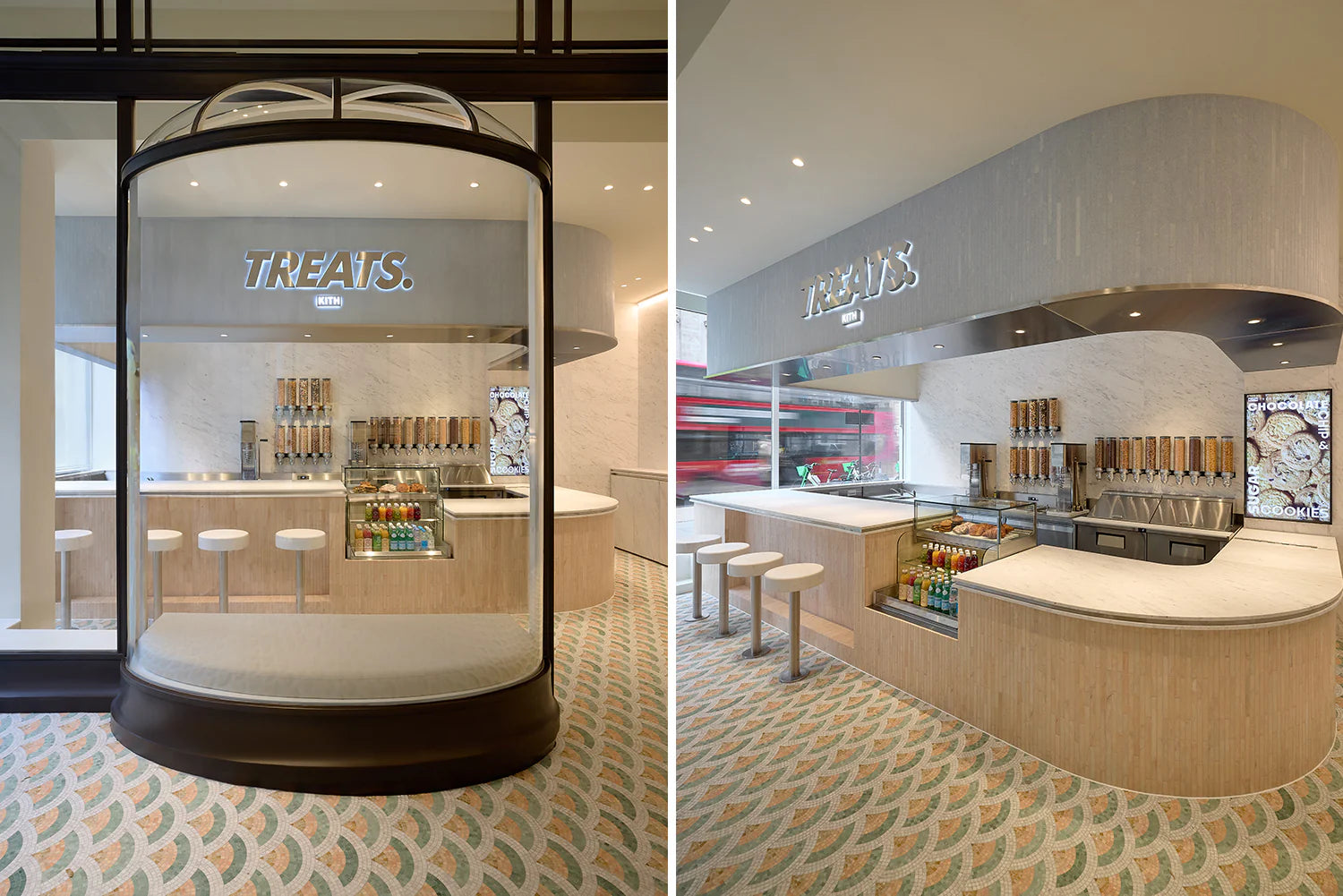 입구 양쪽에는 Kith Kids와 Kith Treats가 자리하고 있습니다. Kith Kids는 시그니처 클라우드 모티프를 천장 구조로 재해석하고, Estremoz 대리석, 커스텀 팬 모자이크, 새틴 브라스 등의 소재를 활용해, 밝고 경쾌한 공간을 완성했습니다. Kith Treats는 클래식 바 스타일 시팅과 은은한 파스텔 팔레트를 기반으로 Rosa Portugalo, Azul Cielo, Volakas 대리석, 그리고 스테인리스 스틸 디테일을 조합하여 세련된 무드를 연출합니다. 런던점에서는 기본 메뉴와 함께 현지 한정 Signature Specials를 제공할 예정입니다.
