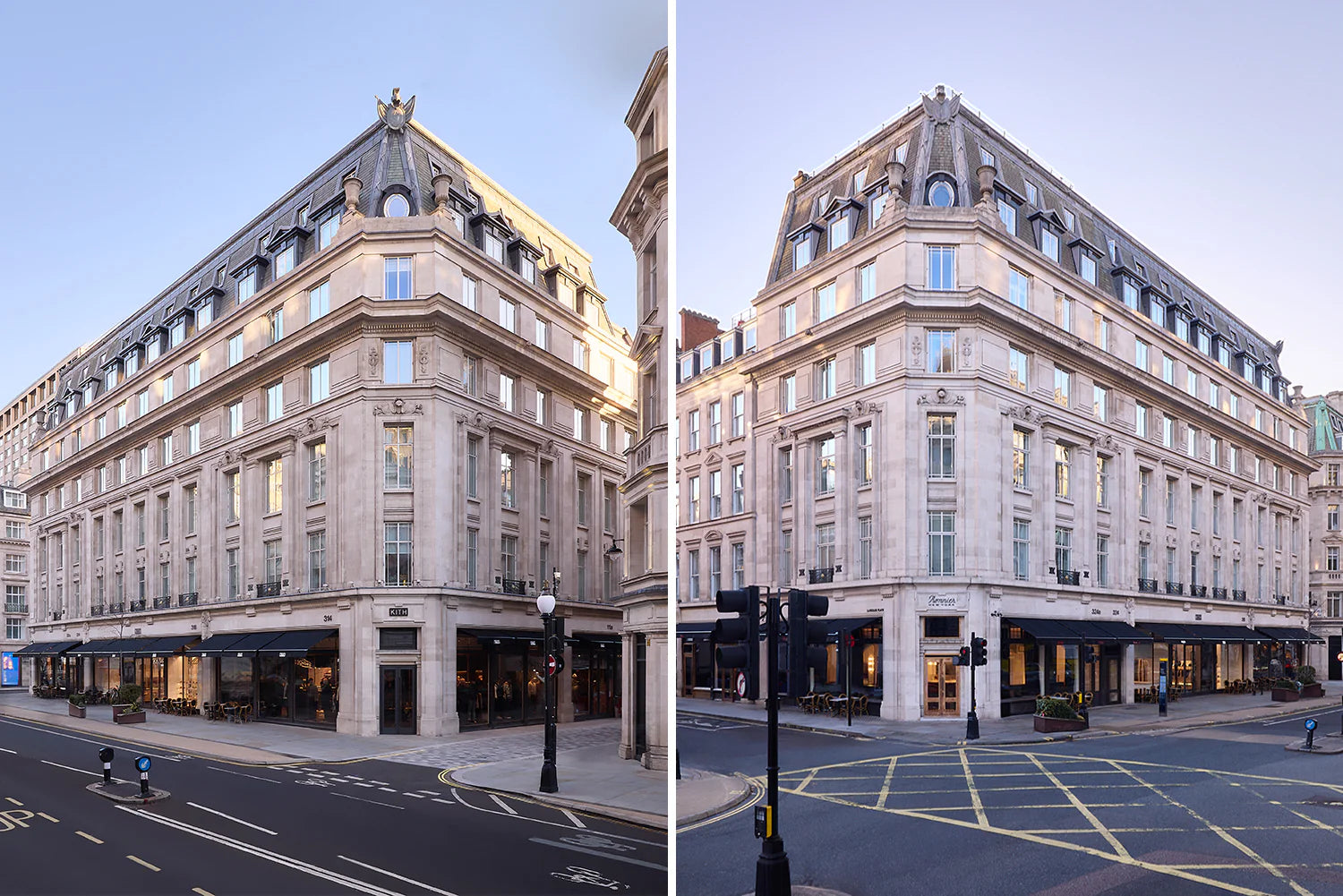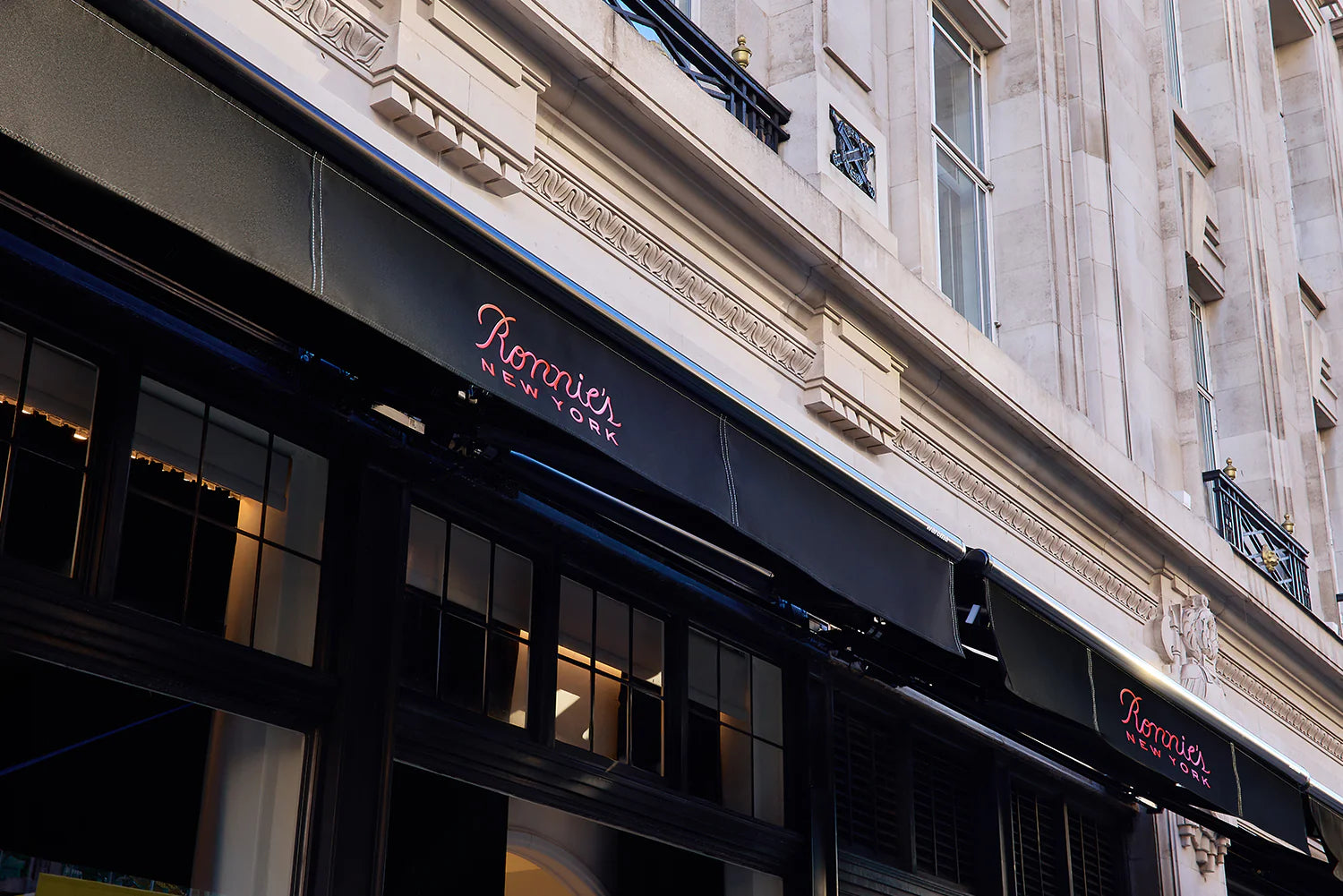 Kith 리테일 공간을 위한 양쪽의 두 개 출입구와 Ronnie’s 전용 출입구로 구성됩니다. 건물 전체 외관은 John Nash가 설계한 오리지널 Regent Street의 구조를 기반으로 하며, 이후 1920년대 재건 시기에 도입된 네오 바로크 양식의 특징을 유지하고 있습니다. 메인 입구는 100년이 넘은 오리지널 곡면 글레이징과 창문을 그대로 보존한 내부 현관이 중심이 되며,런던 건축 유산의 정수를 현대적으로 재해석한 공간입니다. Ronnie Fieg는 Porto Architecture의 건축가 Ben Porto와 협업하여 이번 플래그십의 디자인 비전을 구현했습니다.