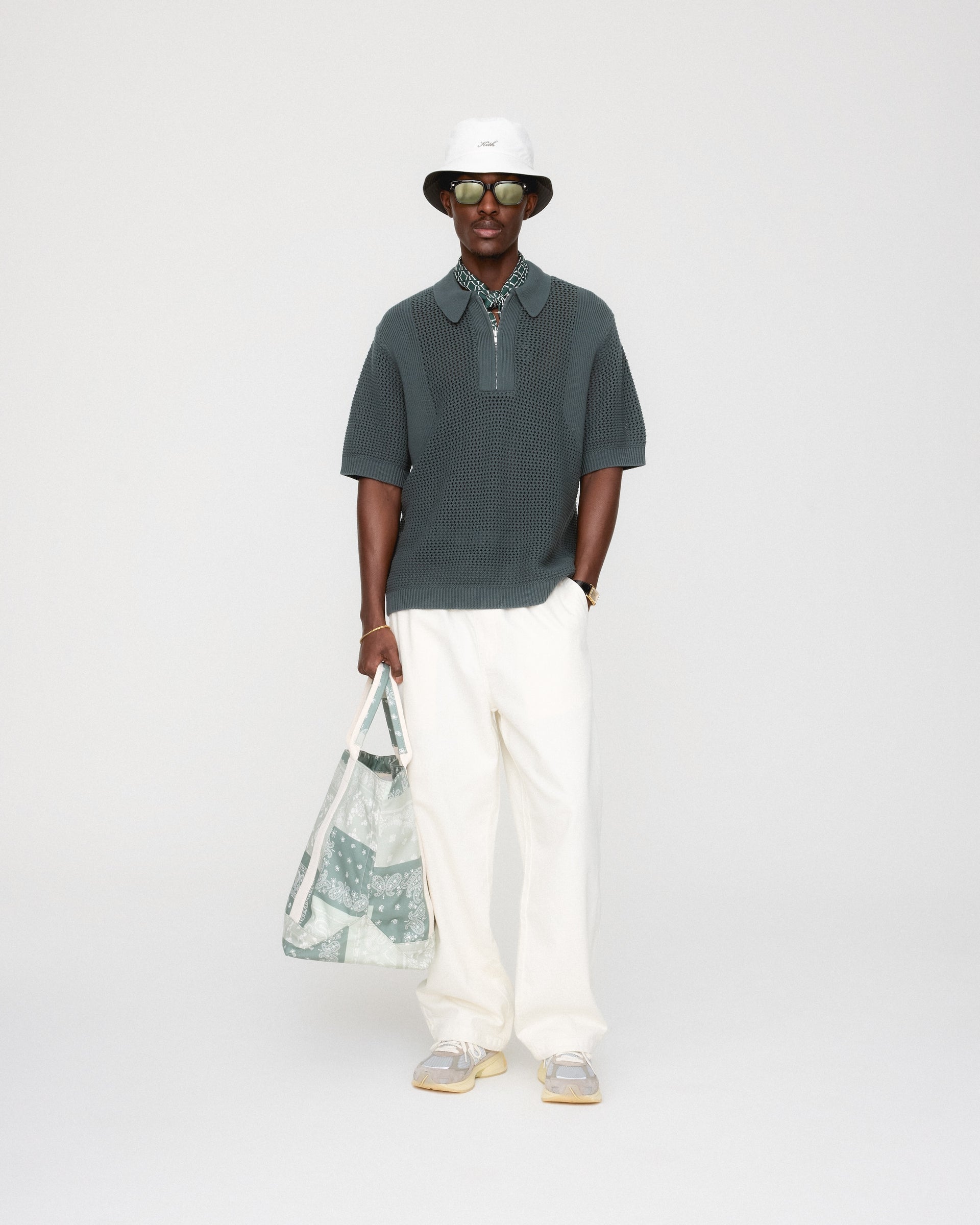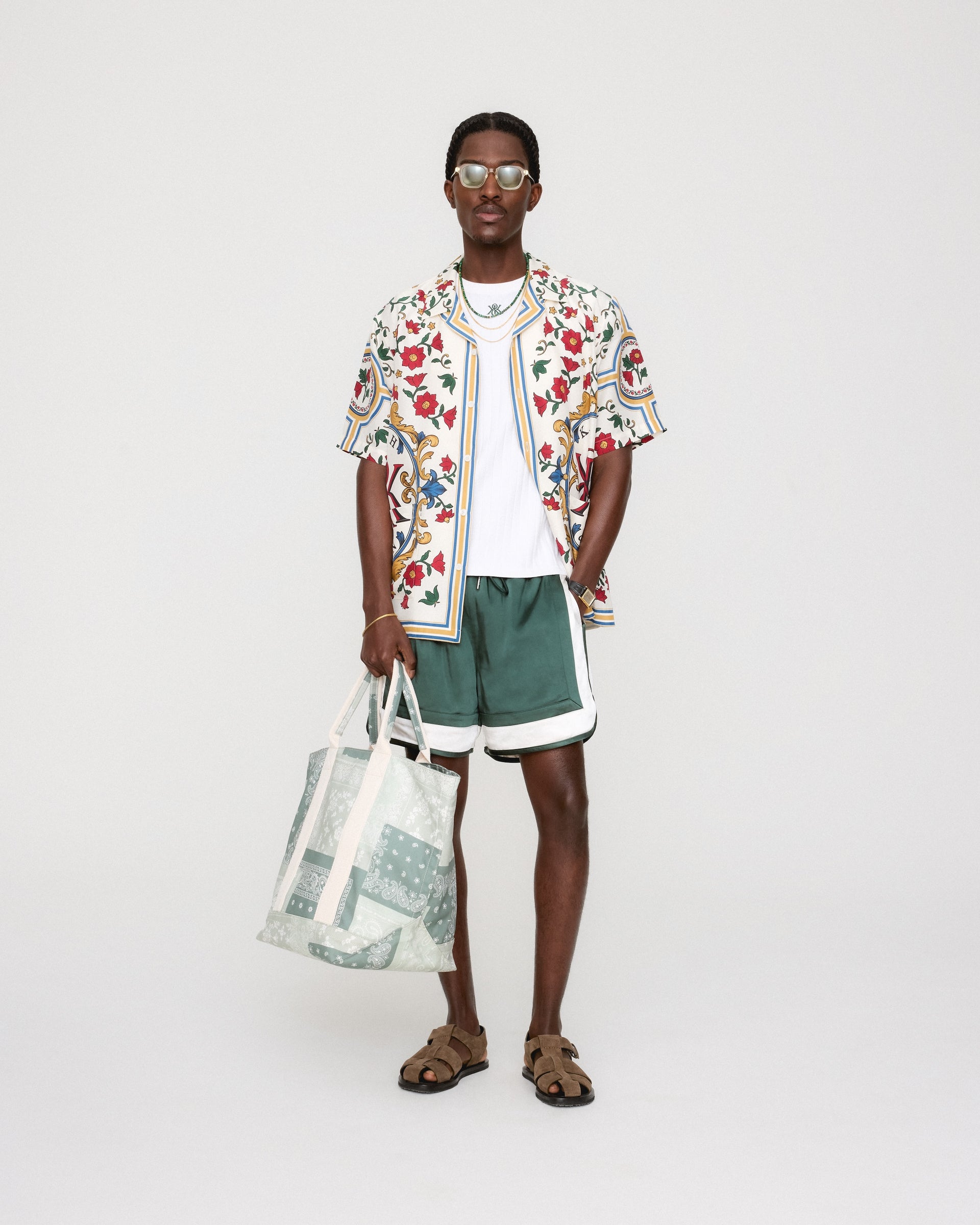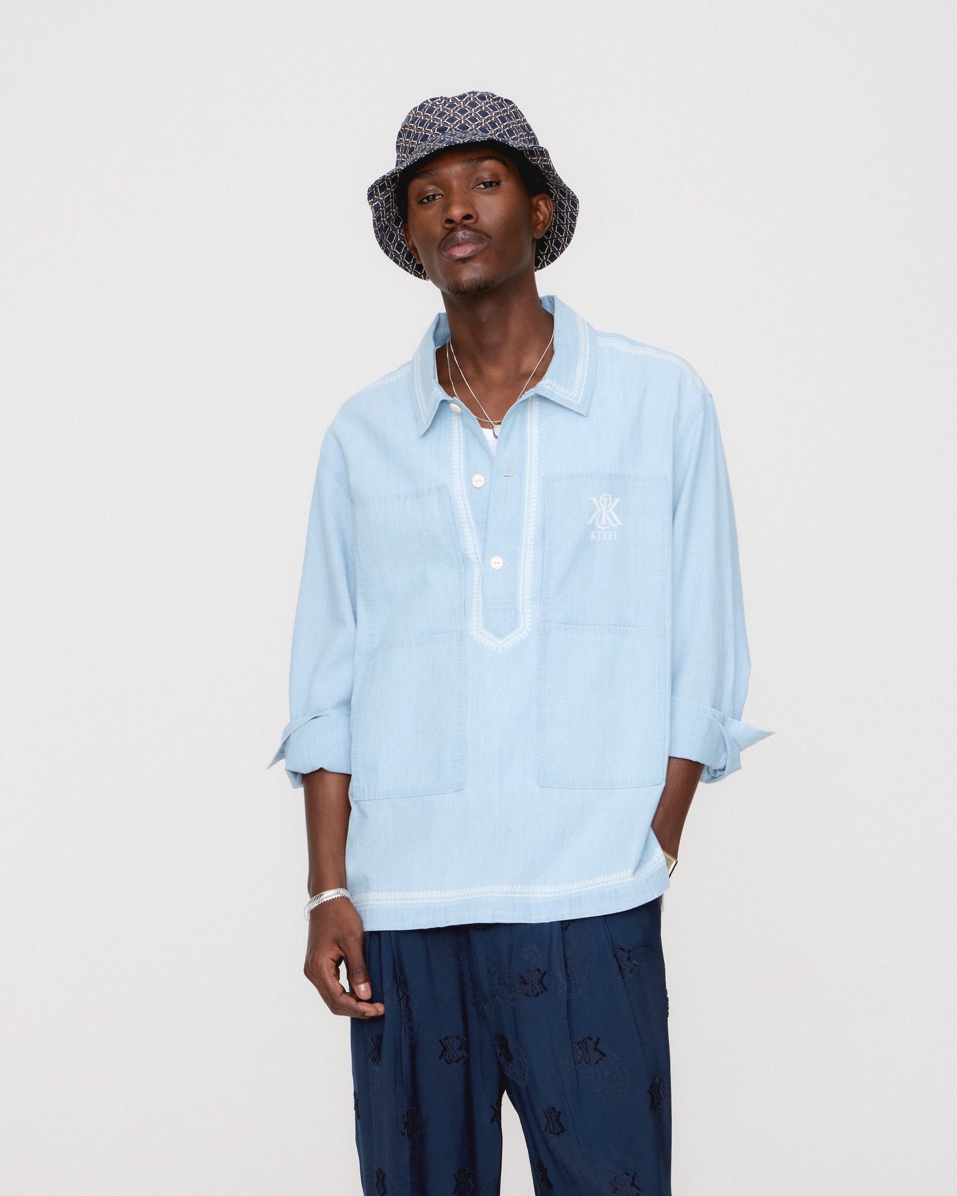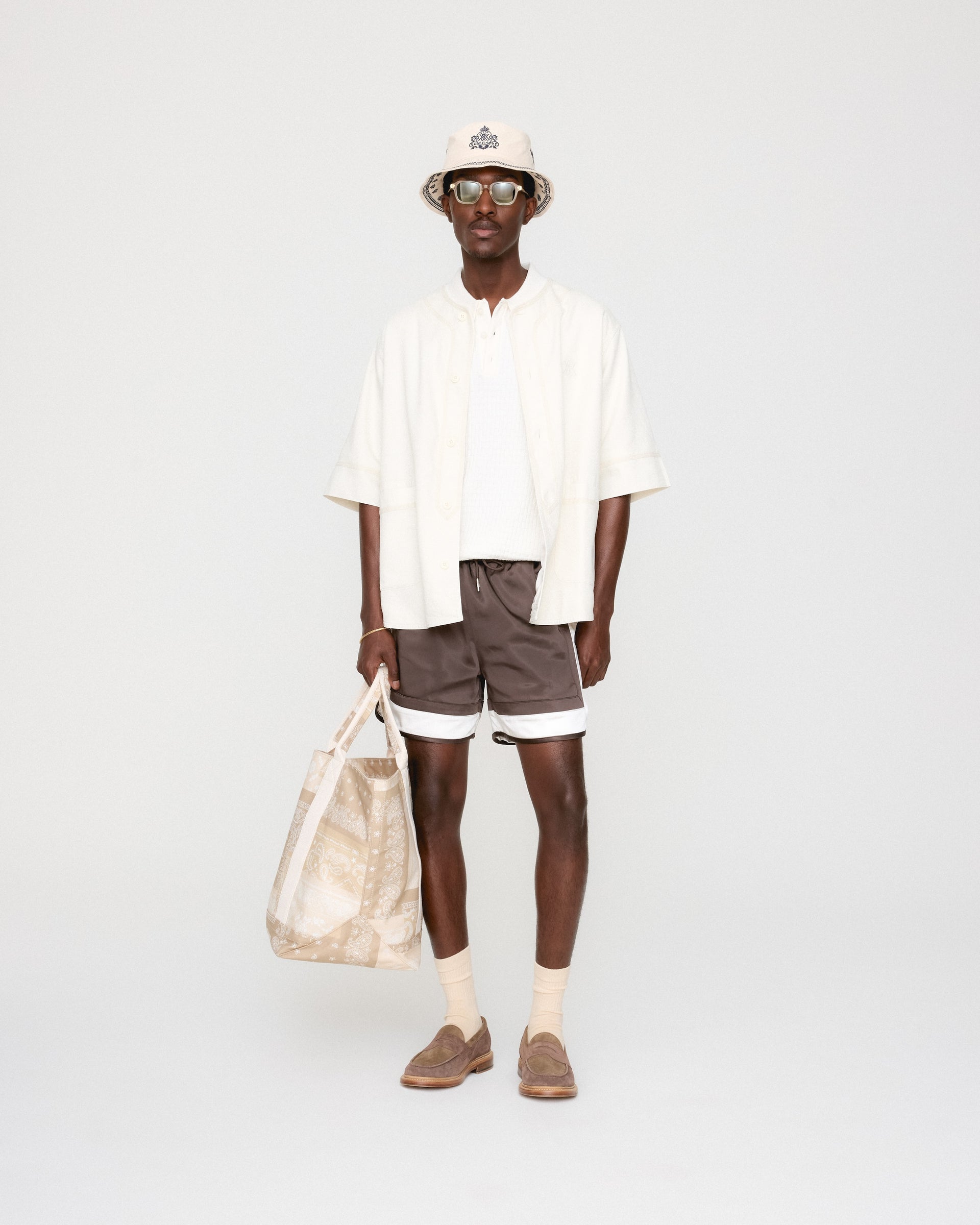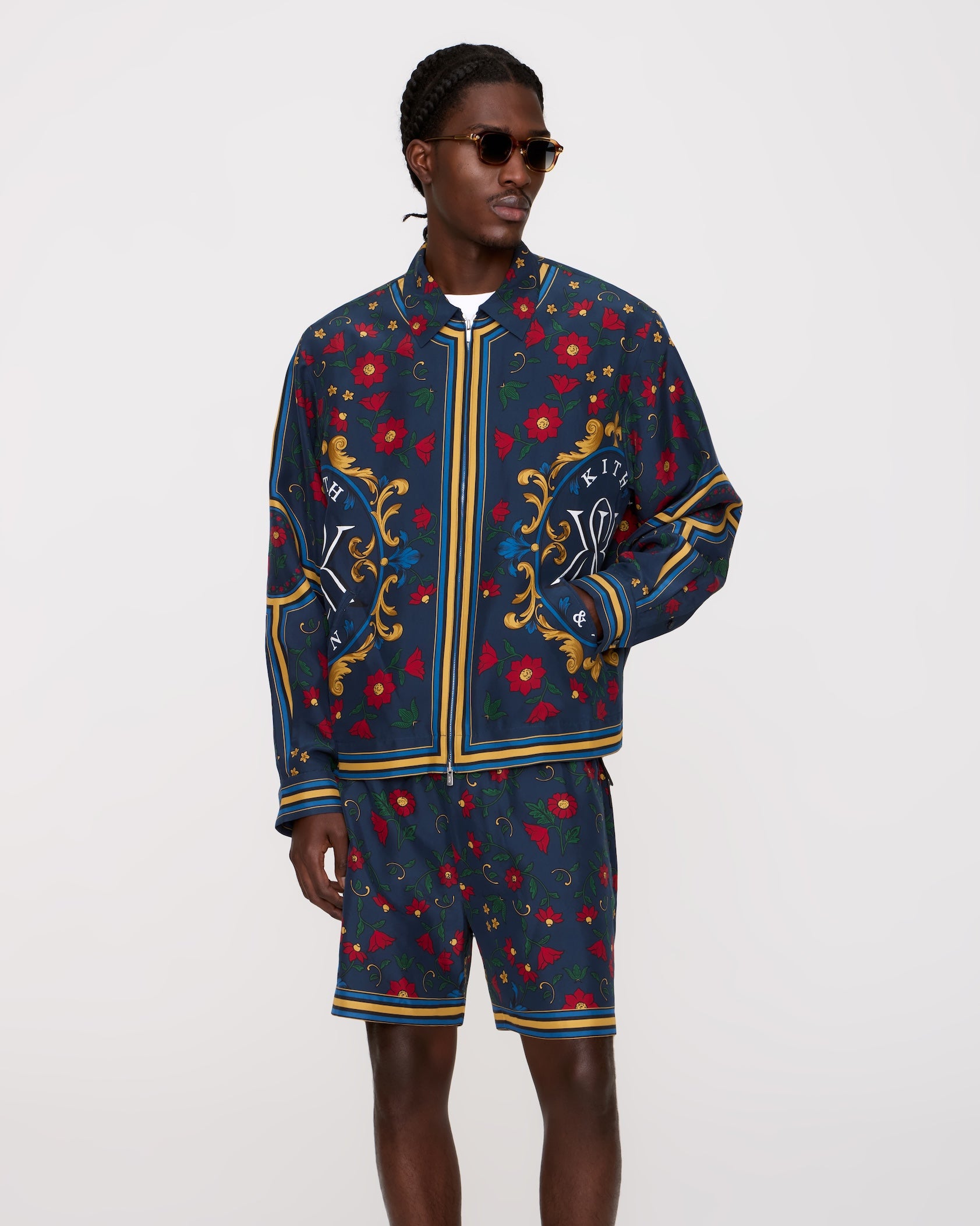 주목할 만한 아이템으로는 Connor Blouson Jacket, Chambray Paterson Pullover, Panelled Bandana Short Sleeve Thompson Shirt, 그리고 Talan Suit가 있습니다. Connor Blouson Jacket은 시간이 지나도 변치 않는 고급스러운 실루엣으로, 솔리드 컬러의 더블 크레이프 소재로 제작된 두 가지 버전과, 100% 샌드워시드 실크 하보타이로 제작된 화려한 프린트 버전이 있습니다. 초경량의 부드러운 샴브레이 코튼으로 제작된 Chambray Paterson Pullover와 Barrow Pant set 는 브러시드 보더 디테일과 연한 데님에서 영감을 받은 디자인이 특징입니다. Thompson Shirts는 Kith의 클래식 실루엣으로, 이번 시즌에는 처음으로 패널 반다나 프린트로 선보입니다. 이 여유로운 핏의 셔츠는 Active Shorts와 함께 스타일링할 수 있도록 디자인되었습니다. 마지막으로 Talan Suit는 여름철을 위한 고급스러운 필수 아이템입니다. 실크처럼 부드러운 촉감의 큐프로와 린넨의 통기성을 결합한 큐프로 린넨 소재로 제작되었으며, 클래식한 재킷 구조에 탈착 가능한 실크 스카프와 더블 플리츠 팬츠가 더해져 정제된 스타일을 완성합니다.