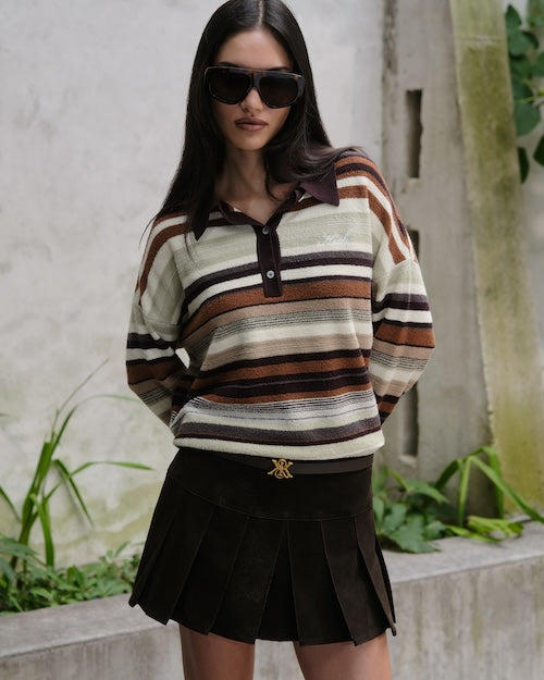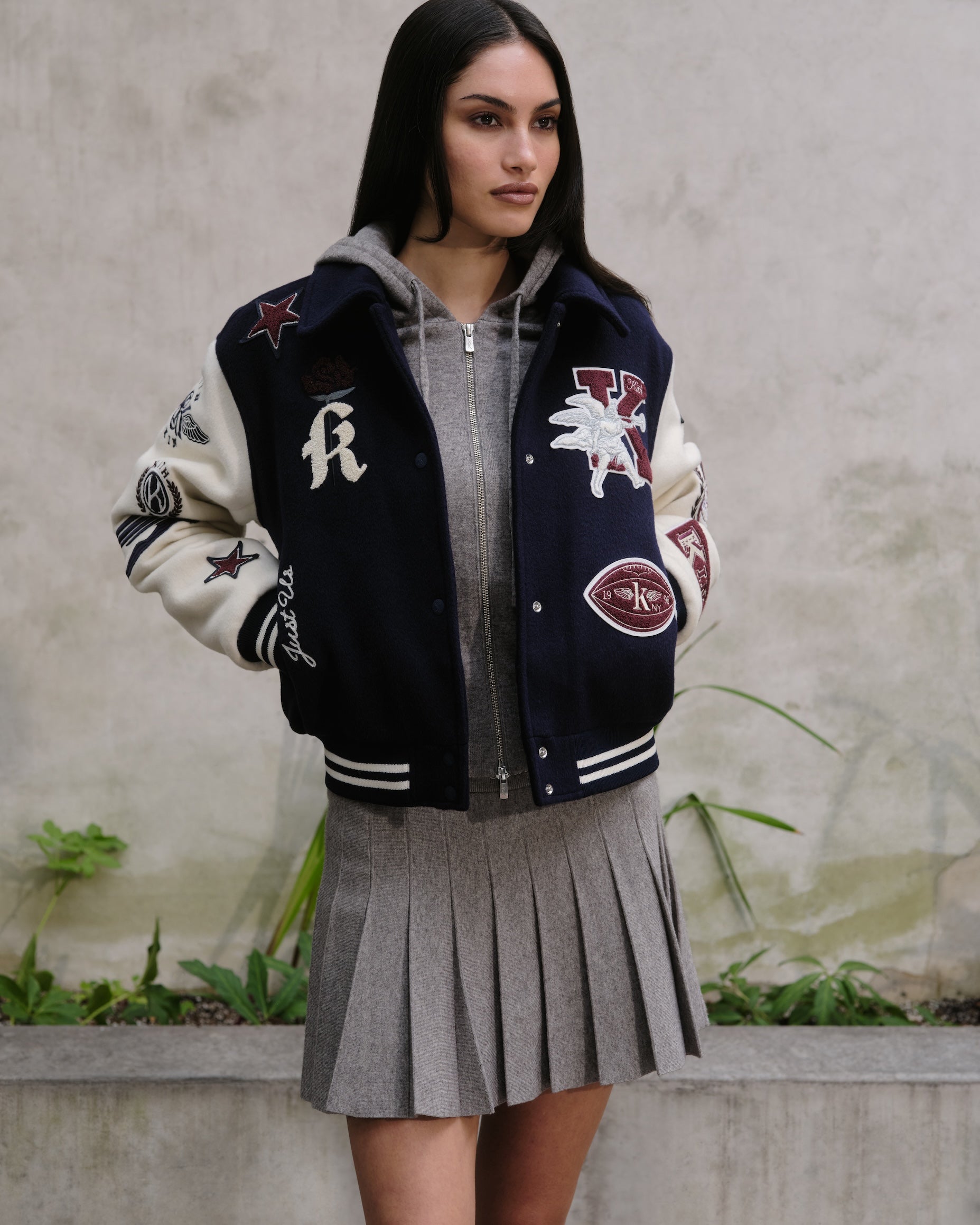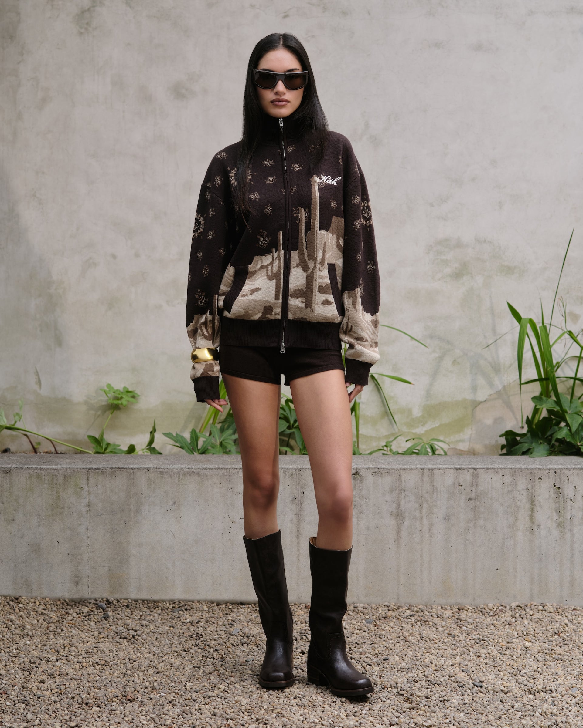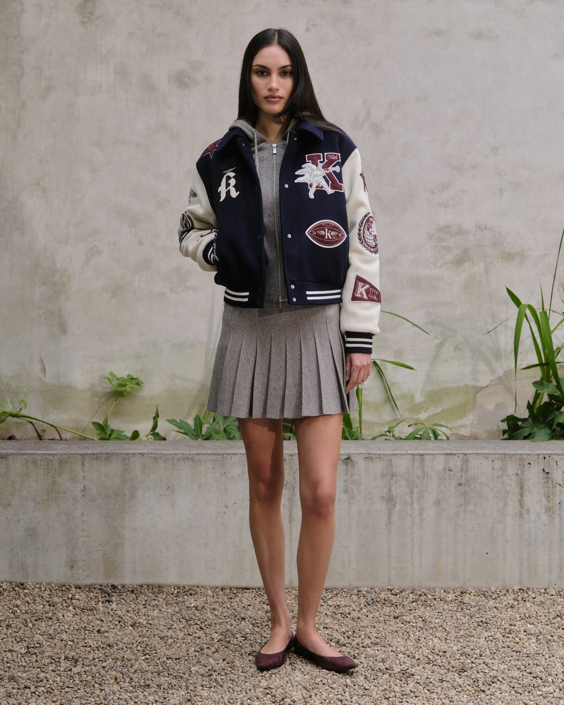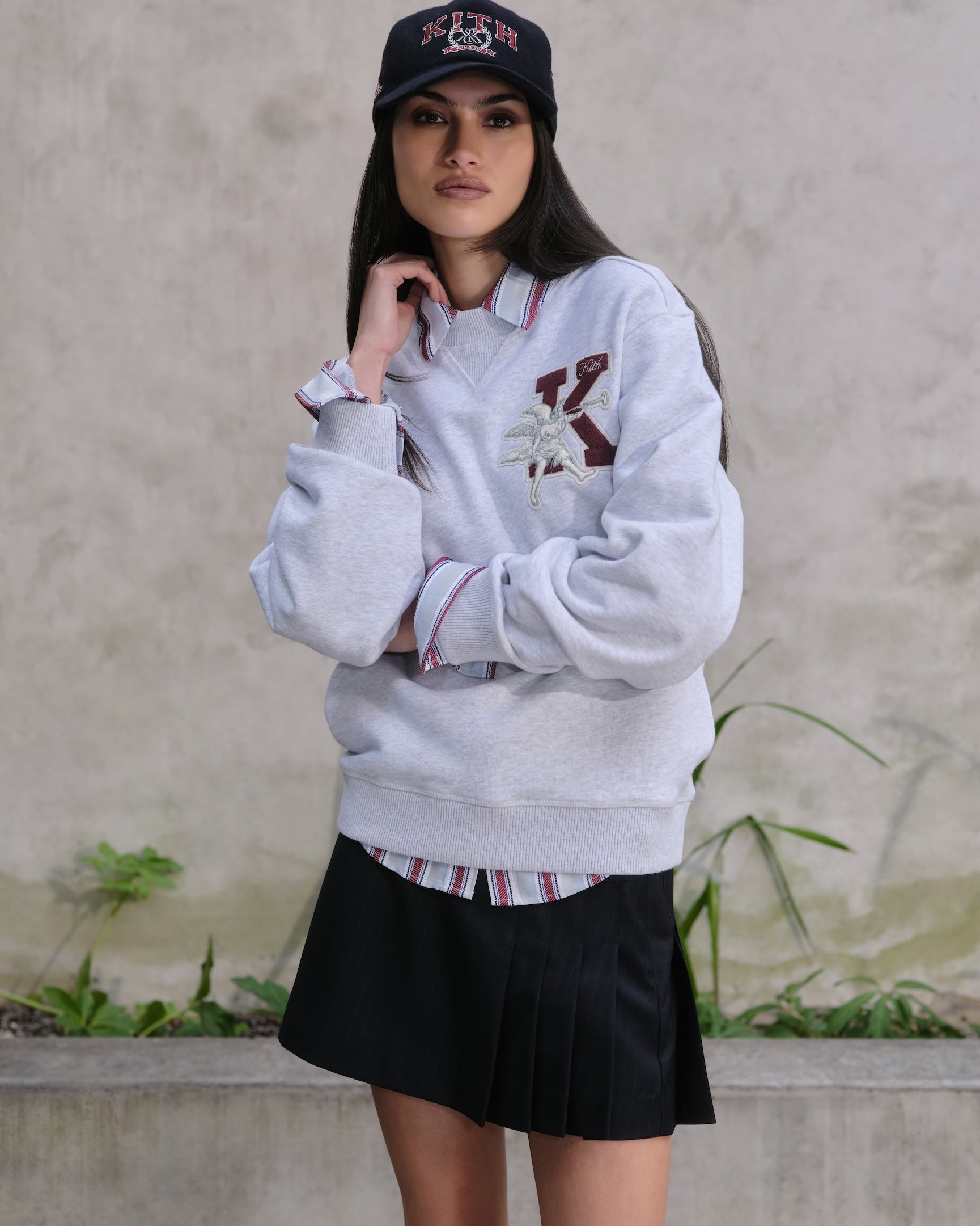 Kith Women Fall 2025 컬렉션은 다양한 실루엣의 코트, 크롭 재킷, 봄버 등으로 구성된 아우터웨어와 추워지는 날씨에 적합한 전환기용 니트웨어, 그리고 활용도가 높은 매칭 세트로 구성 되었습니다. 이번 컬렉션은 컬리지 스타일의 그래픽을 특징으로 하며, Campbell II Melton Varsity Bomber, Ashwin Polo Sweater, Tanner NY Apple Hoodie 제품에서 확인할 수 있습니다. 또한 낮부터 밤까지 착용 가능한 테일러드 셋업 제품의 Corwin Script Faille Jacket, Eliah Boucle Tank, Riko Script Faille Mini Skirt, 그리고 Western 무드에서 영감받은 실루엣인 Palesa Moto Jacket, Miren Paisley Pant, 그리고 다양한 그래픽 티셔츠도 포함되어 있습니다. 이번 컬렉션에 주요 소재로는 테일러드 실루엣에 이상적인 자카드 파이유 블렌드, 환절기용 울, 고급스러운 촉감을 위한 파인 브러시드 인터록이 사용되었습니다.