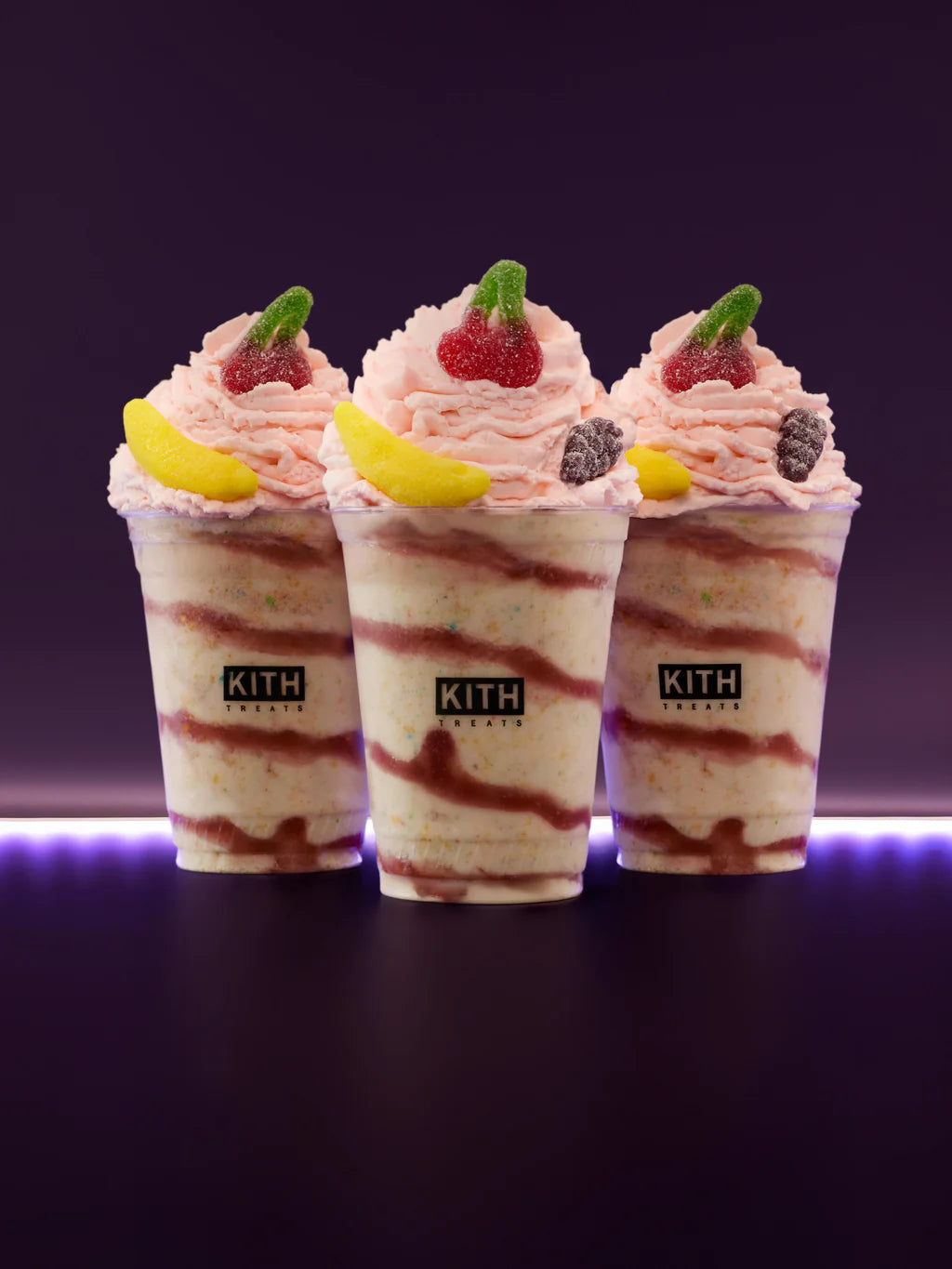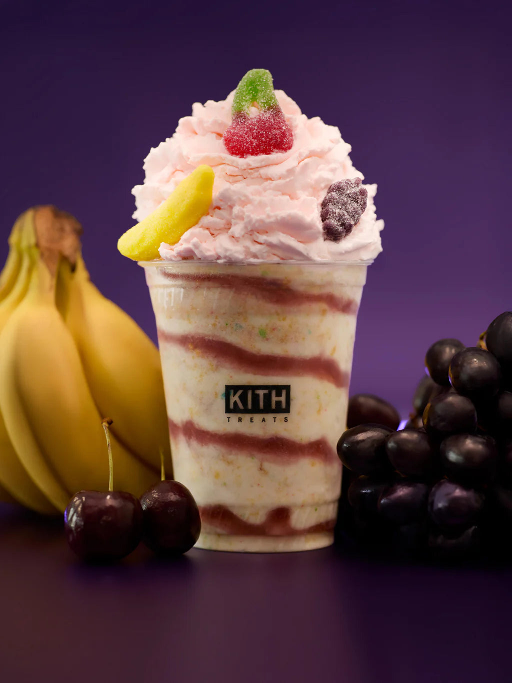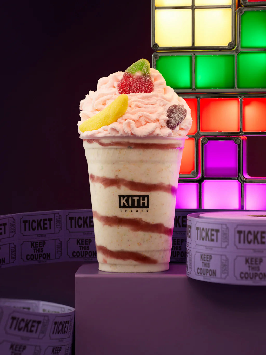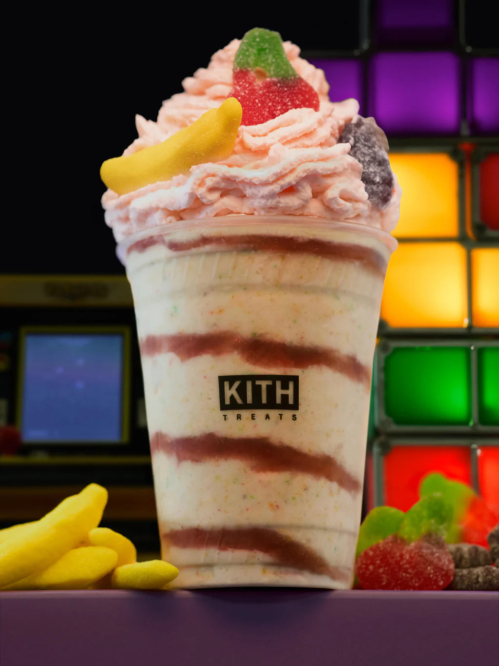 컬렉션의 출시와 함께, Kith Treats는 캡슐 그래픽에서 찾아볼 수 있는 아케이드 스타일 “Power-up” 과일에서 영감을 받아 체리, 바나나, 포도를 생생하게 조합한 특별한 밀크쉐이크도 선보입니다.