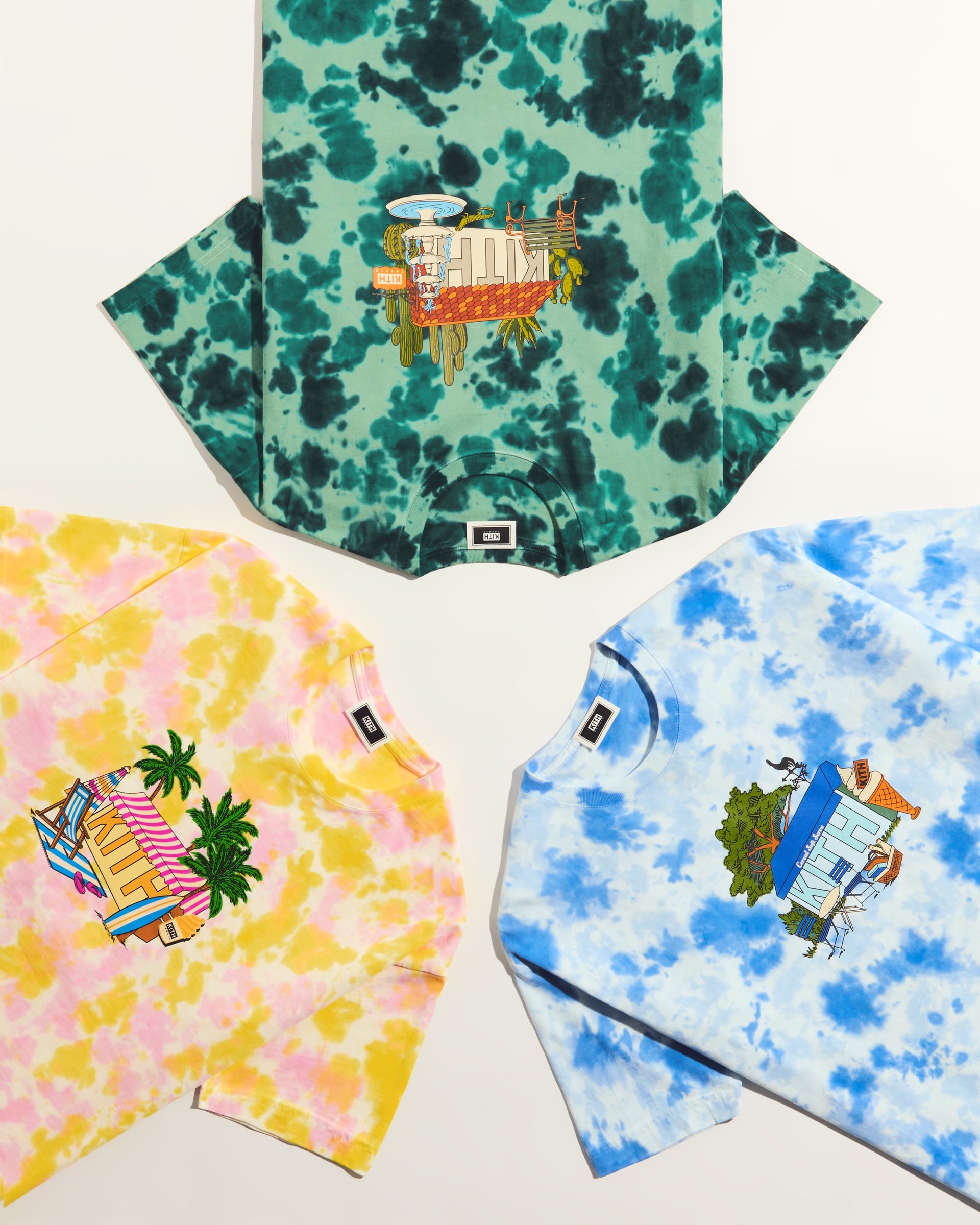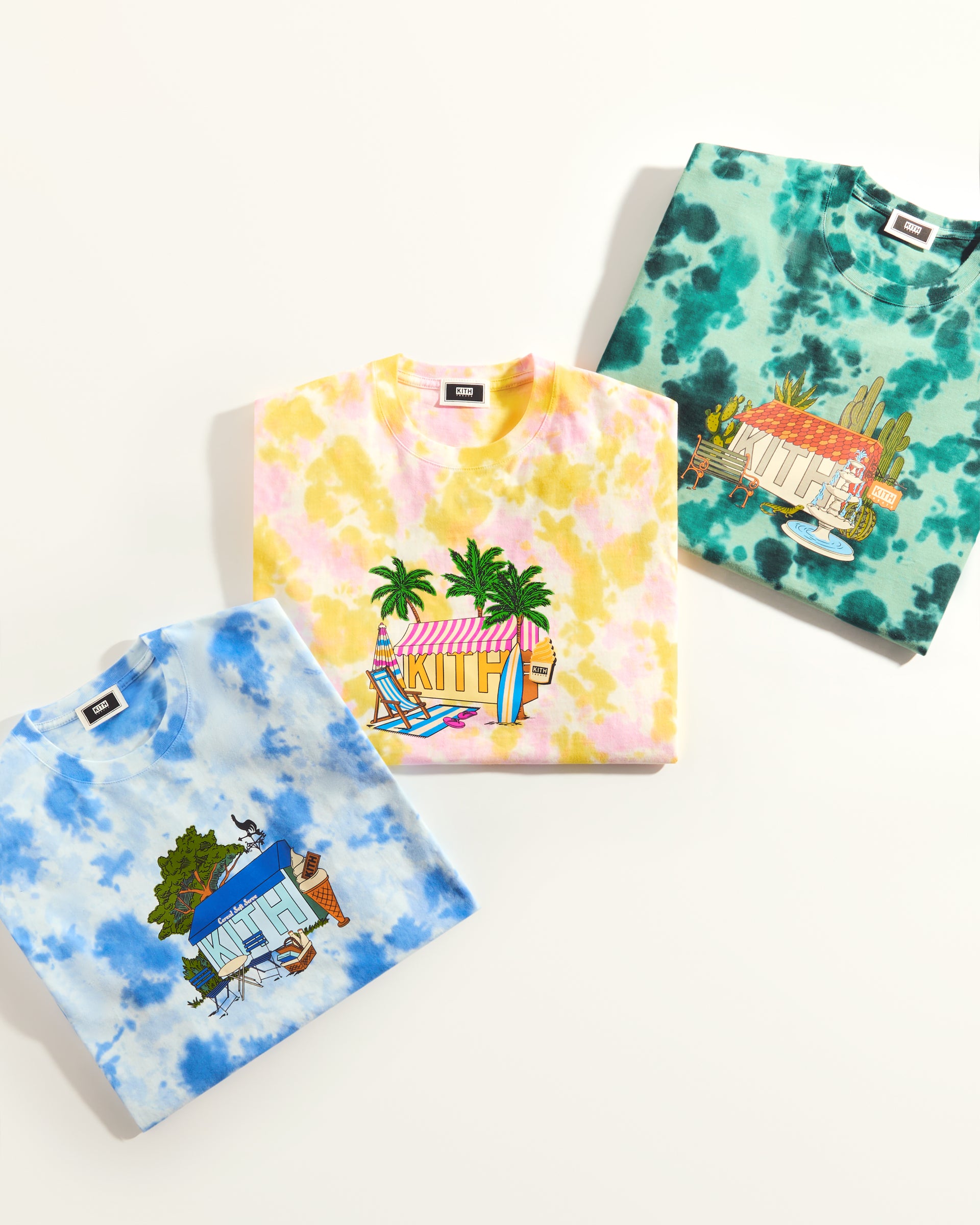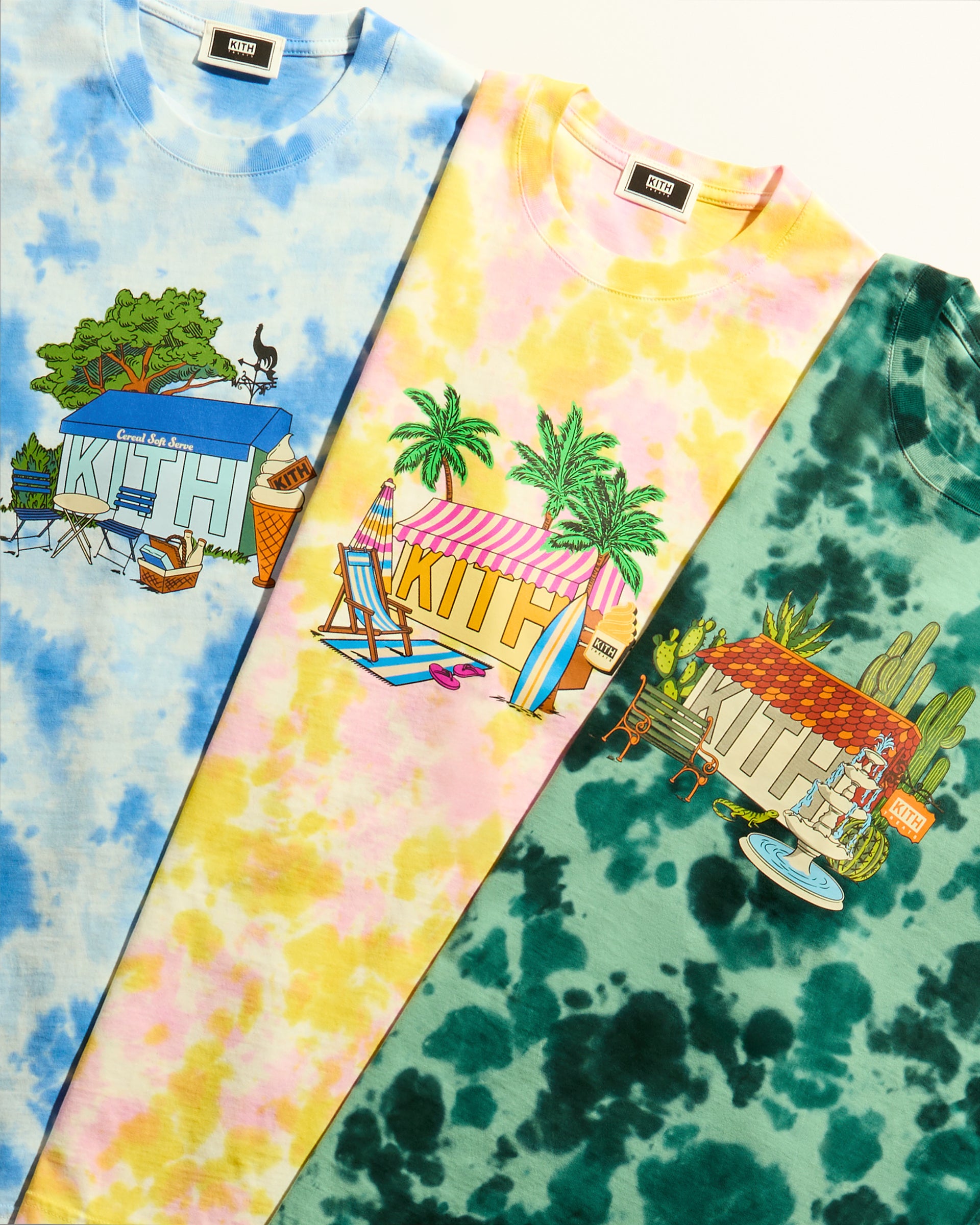 이번 컬렉션은 트로피컬, 해변, 사막을 테마로 한 Kith Treats 매장이 일러스트로 그려진 타이다이 그래픽 티셔츠 3종으로 구성되어 있습니다.