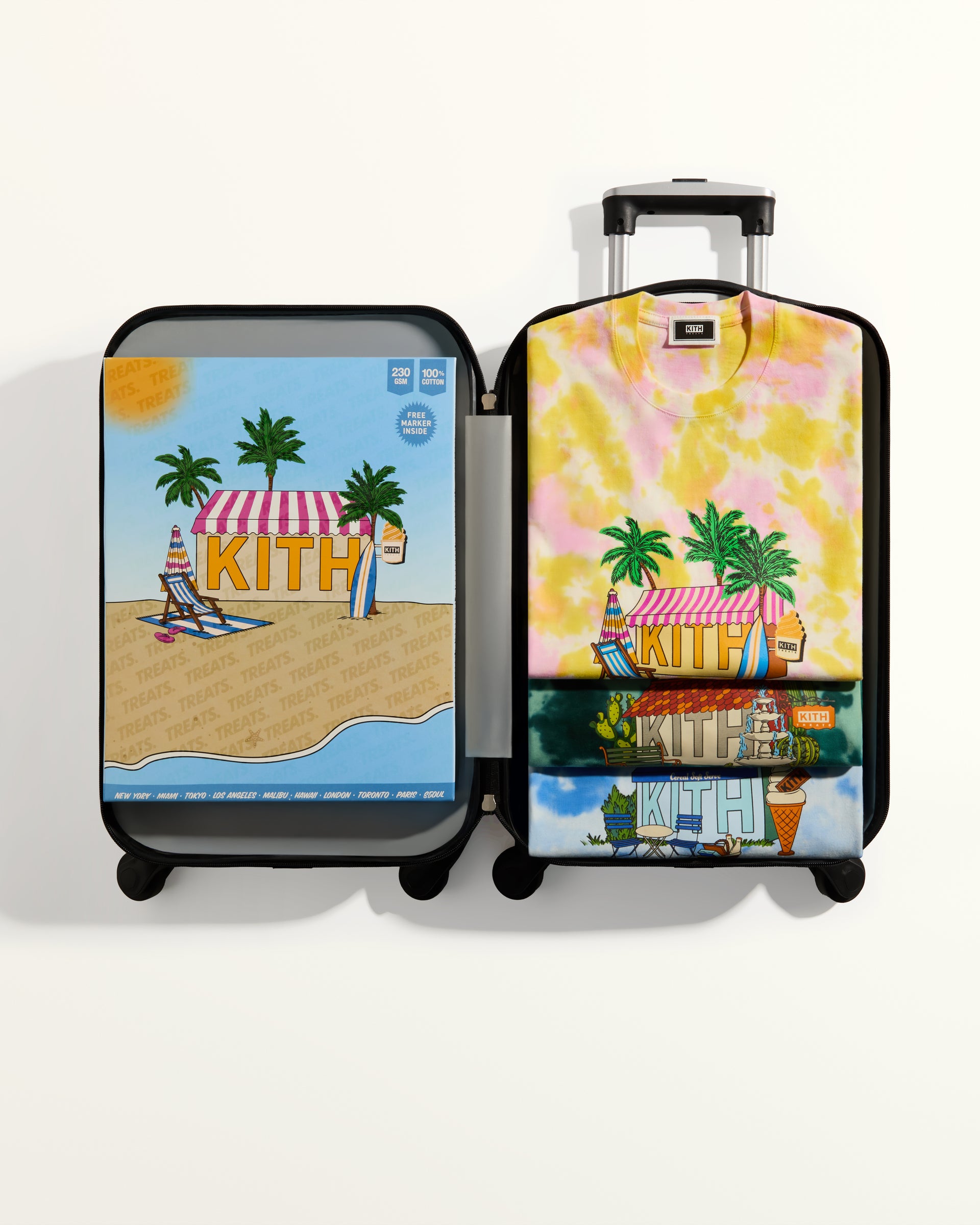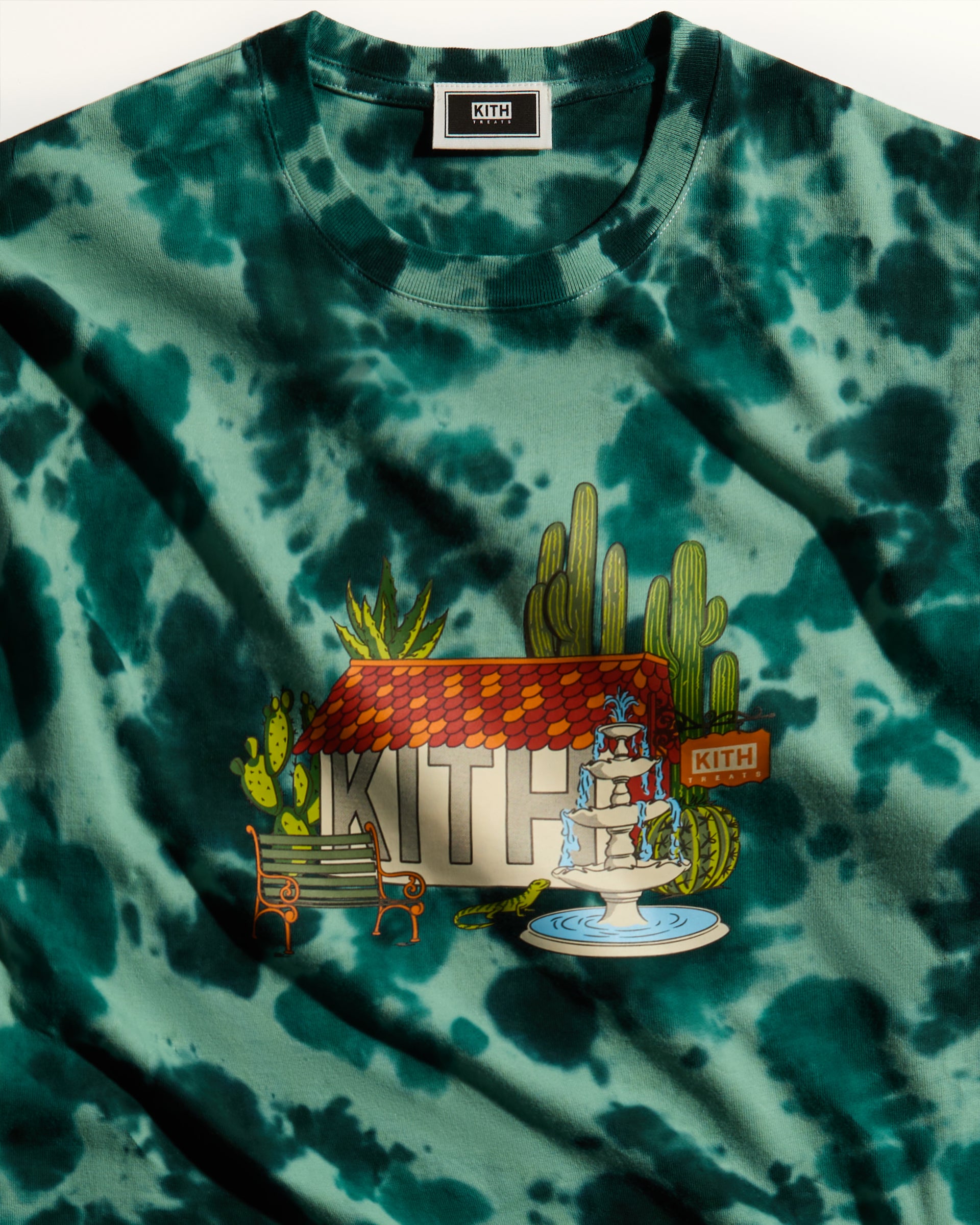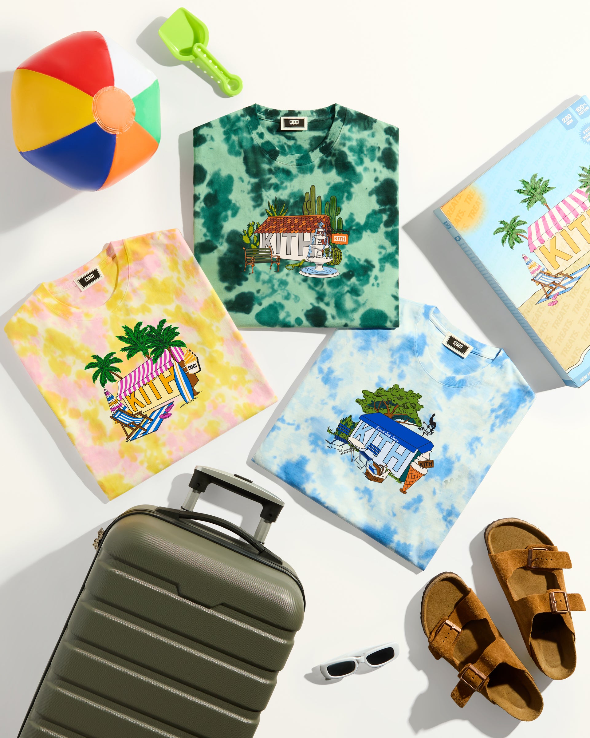 이번 컬렉션은 트로피컬, 해변, 사막을 테마로 한 Kith Treats 매장이 일러스트로 그려진 타이다이 그래픽 티셔츠 3종으로 구성되어 있습니다.