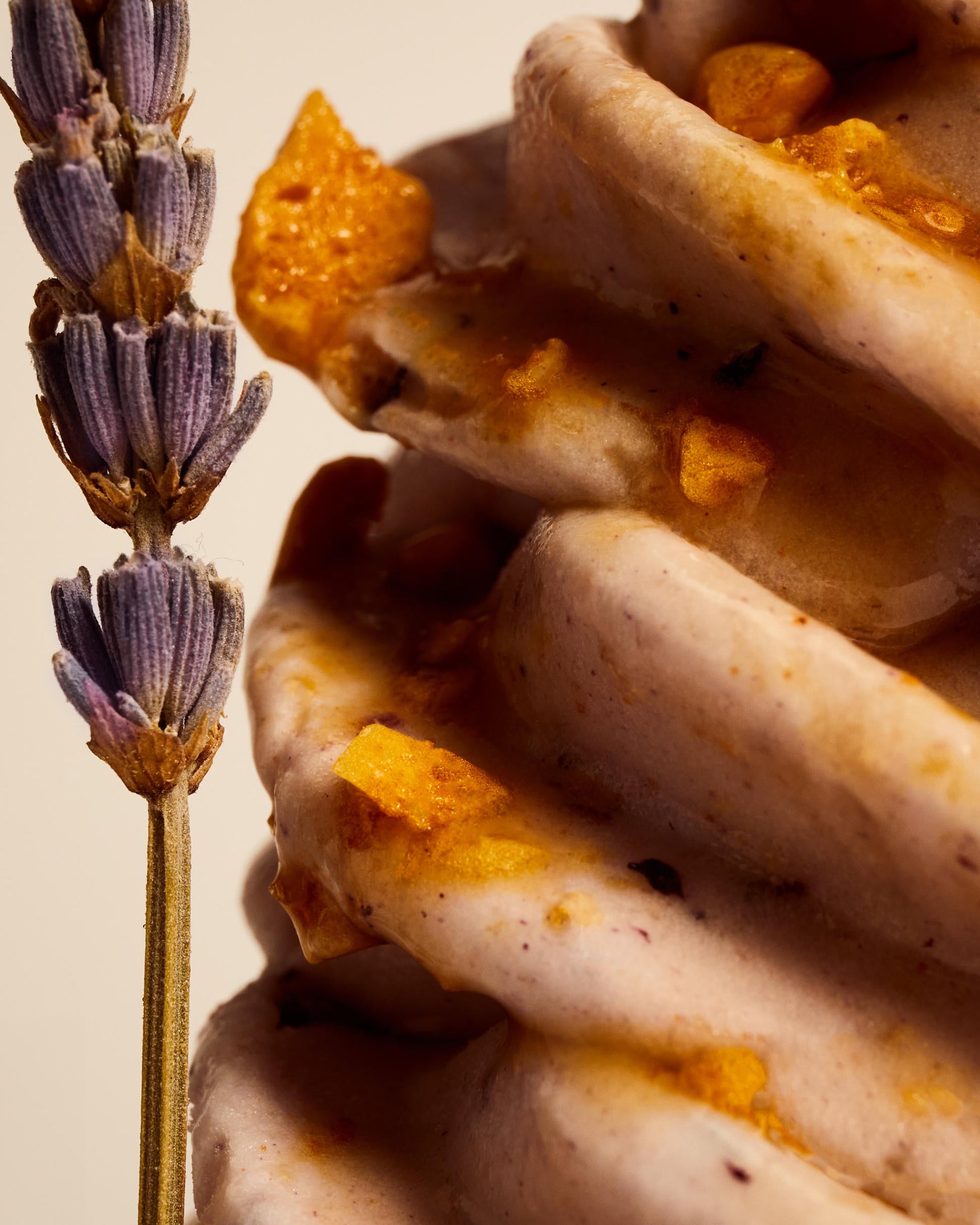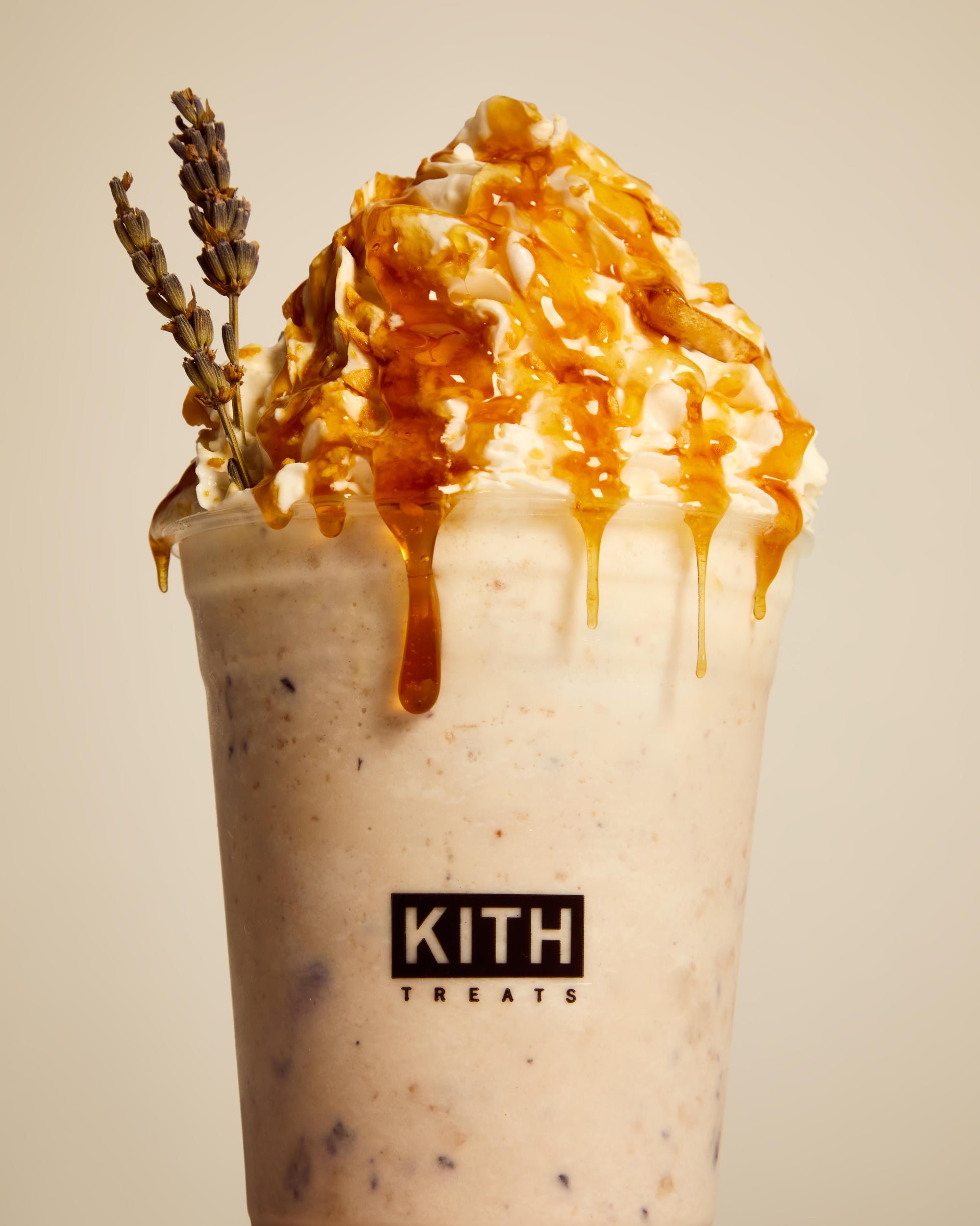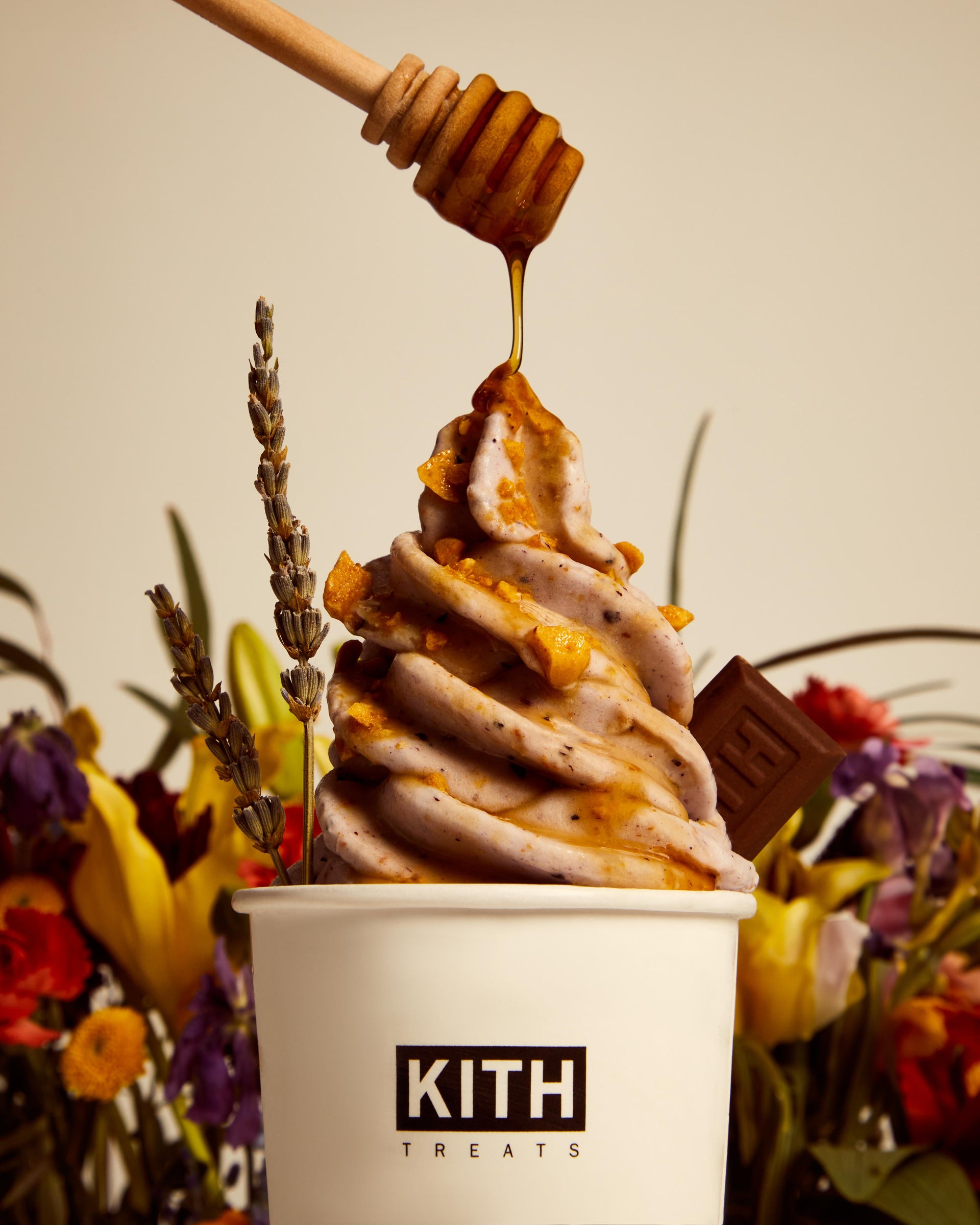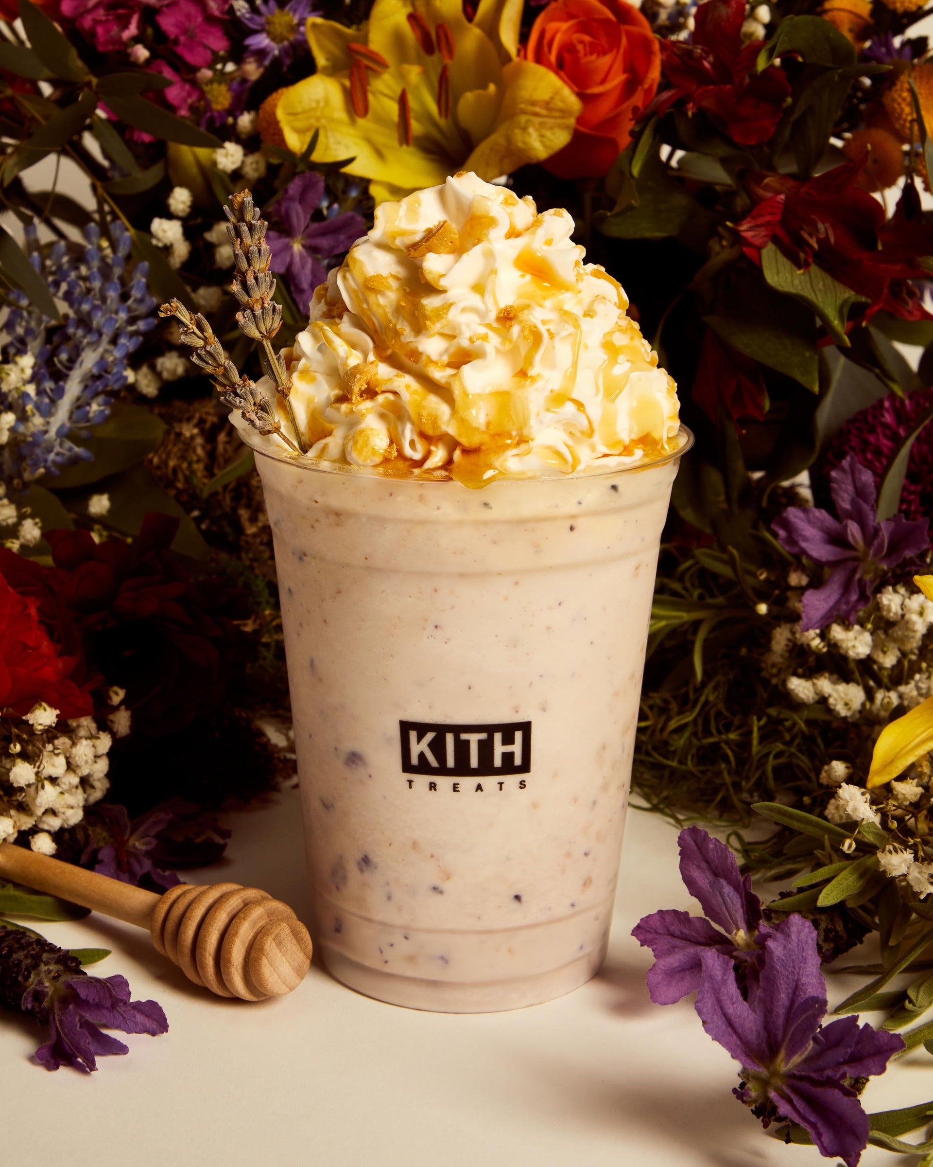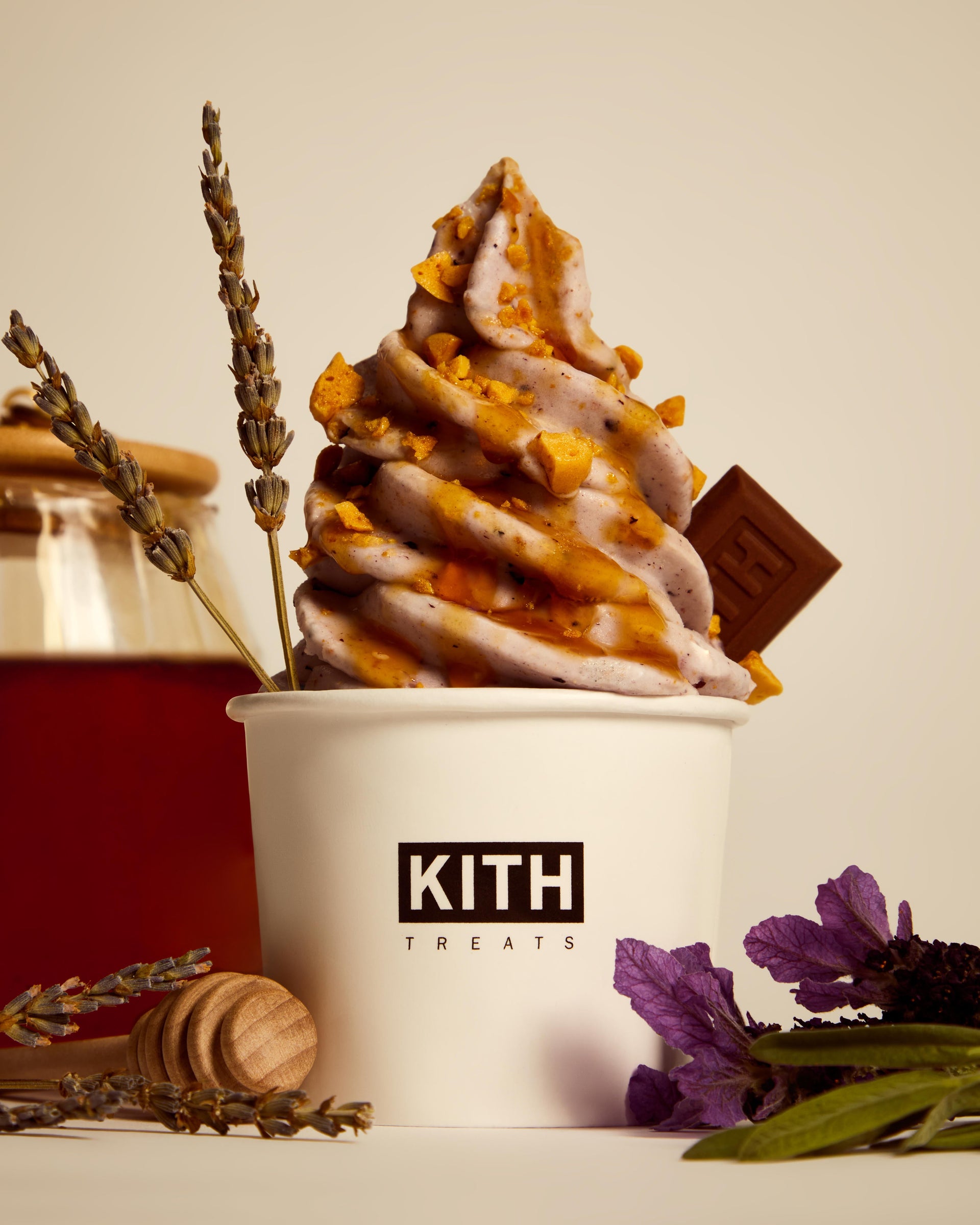 치리오스 오트 크런치, 허니 번, 라벤더 밀크티&블루베리를 넣고 으깬 달고나(벌집) 사탕이 올라간 Kith Treats 시그니처 바닐라 아이스크림입니다. 아로마틱 라벤더 가니쉬에 100% 순수 허니 드리즐로 마무리했습니다.