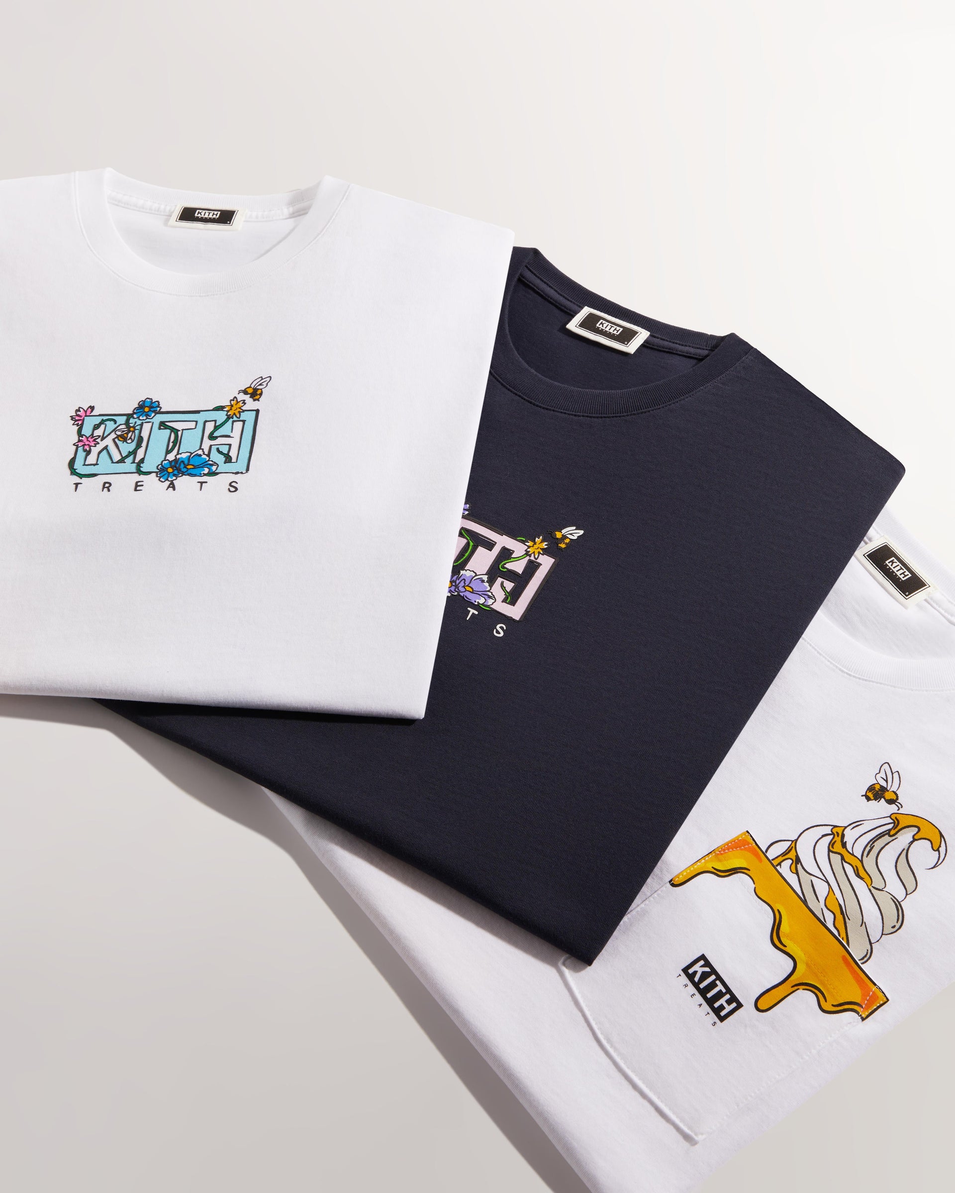 Kith Treats는 시그니처 시리얼이 들어간 아이스크림과 자연에서 나온 황금 과즙의 조합에 영감을 받아 다섯가지 제품으로 이루어진 캡슐 컬렉션, Treats Honey의 두 번째 시리즈를 선보입니다. 이 시리즈는 Kith의 시그니처인 빈티지 티 실루엣의 세가지 컬러웨이에 맞춤형 모노그램 허니팟 그래픽과 플로럴 워드마크 일러스트레이션이 더해진 컬렉션입니다.