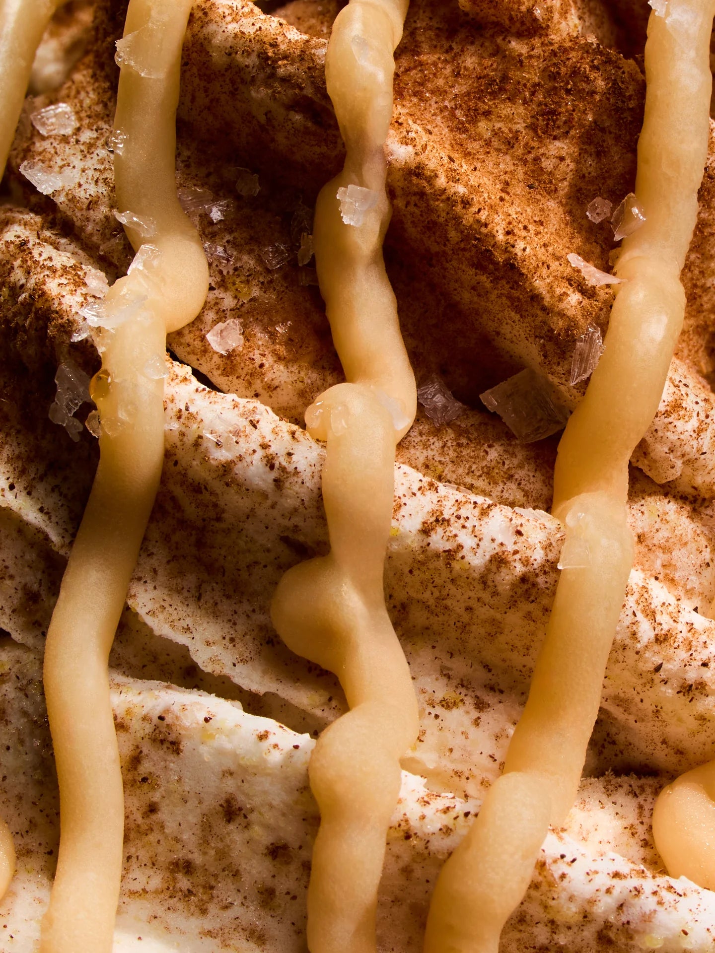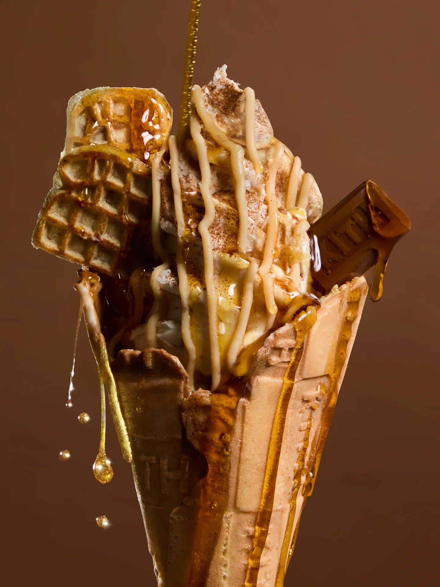시나몬 토스트 크런치가 블렌딩된 바닐라 아이스크림, 프렌치 토스트 크런치 & 메이플 시럽에 적신 와플로 완성, 휘핑 버터 메이플 시럽 드리즐, 시나몬 파우더 & 말돈 소금 그리고 에고 미니 시나몬 와플 가니쉬 토핑