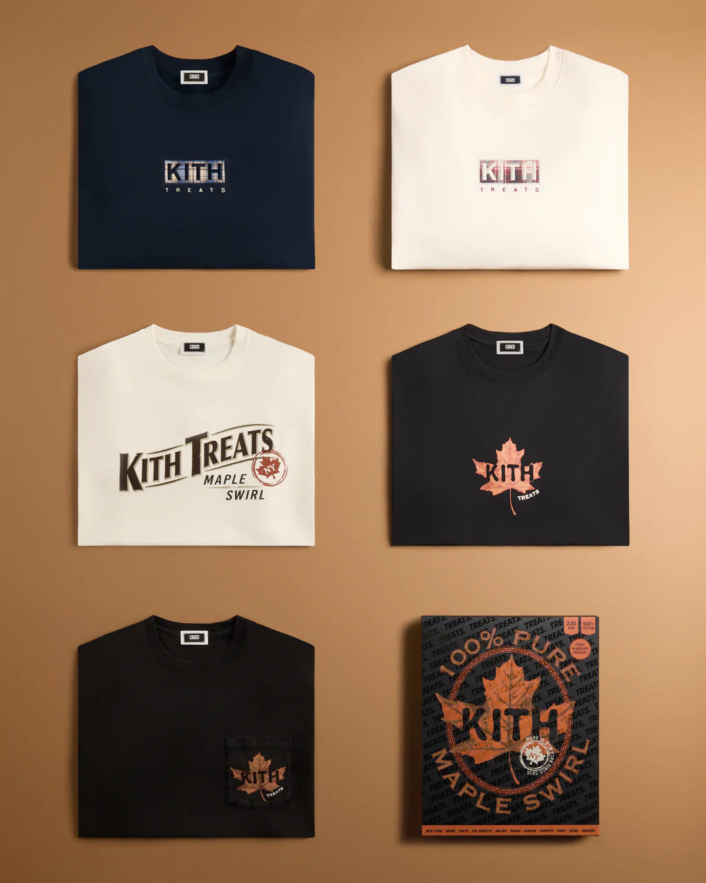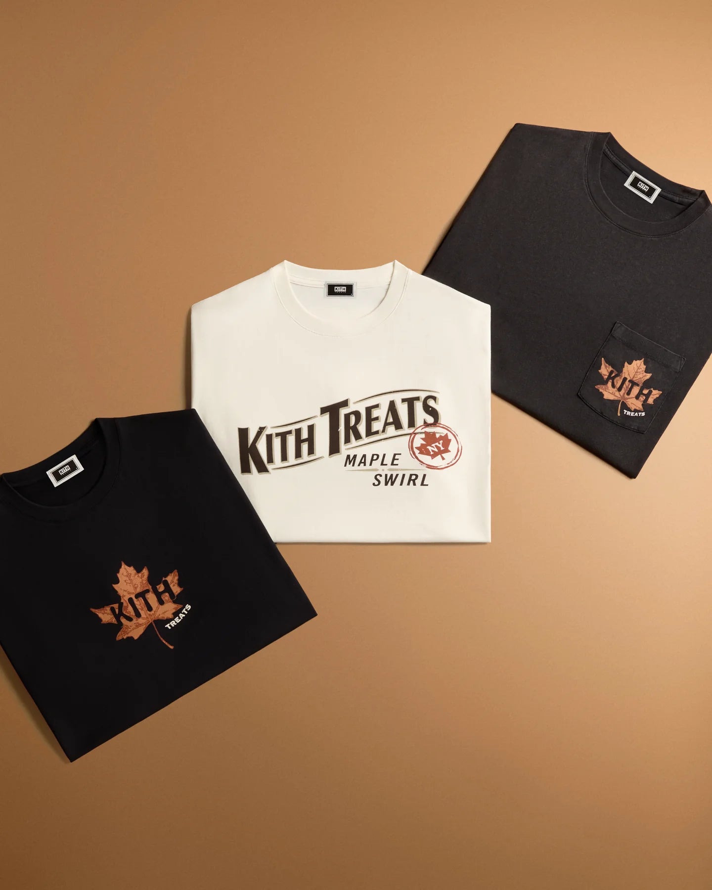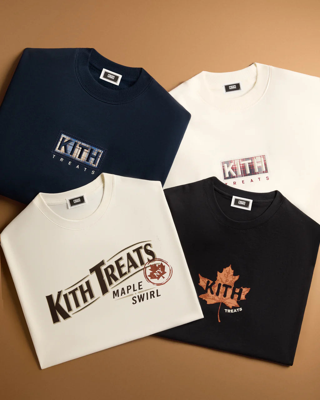 Treats Maple의 출시와 함께, Kith Treats는 황금빛 메이플 시럽이 녹아든 시그니처 바닐라 아이스크림을 베이스으로, 이번 캡슐 컬렉션의 그래픽을 그대로 맛으로 표현한 한정판 아이스크림 스월 & 밀크셰이크를 선보입니다. 컬렉션과 스페셜 메뉴가 함께 어우러져 가을의 정취를 완벽하게 담아내며, 선선한 공기, 포근한 레이어, 그리고 풍부한 가을의 맛이 만나는 순간을 선사합니다.