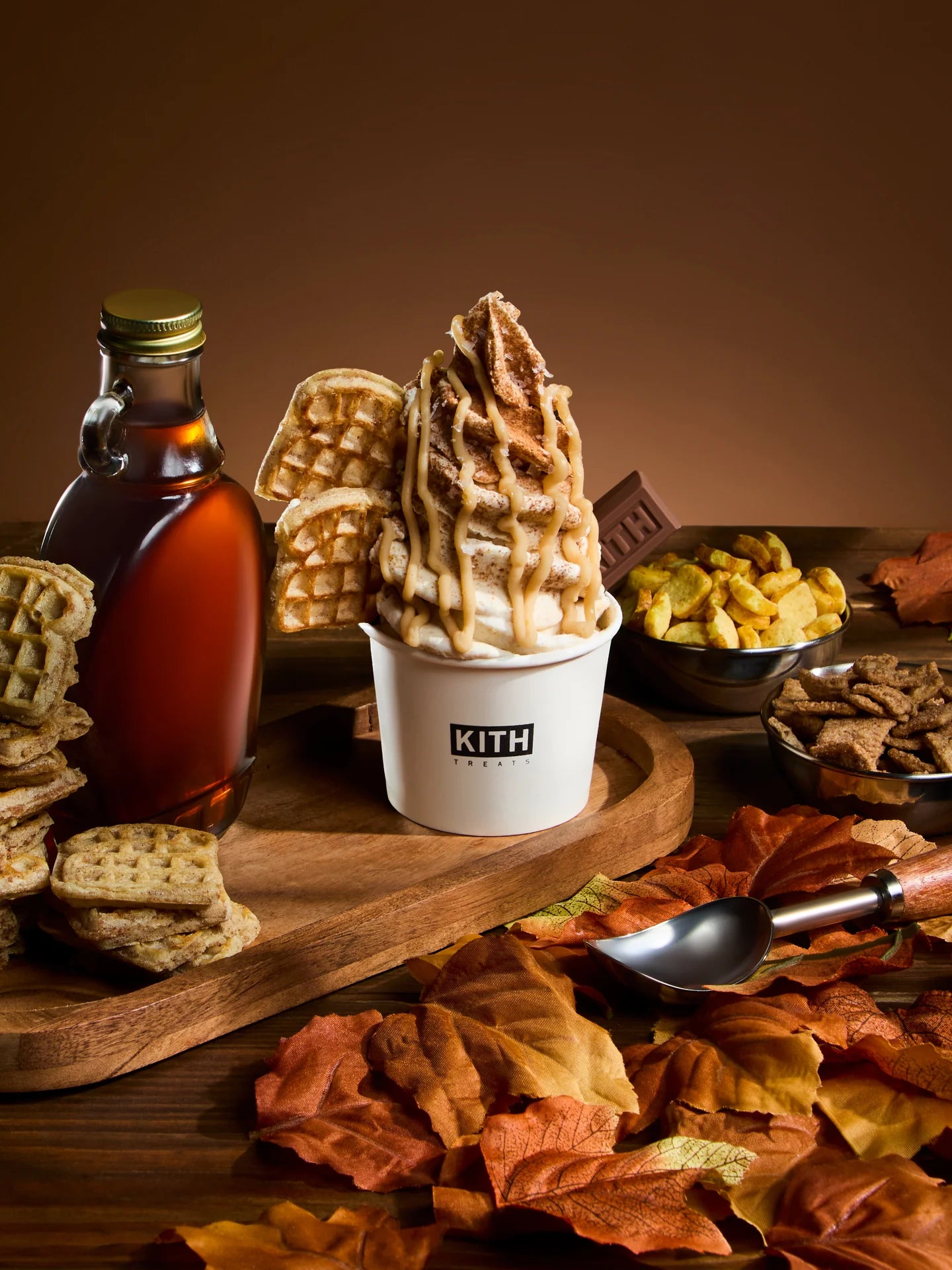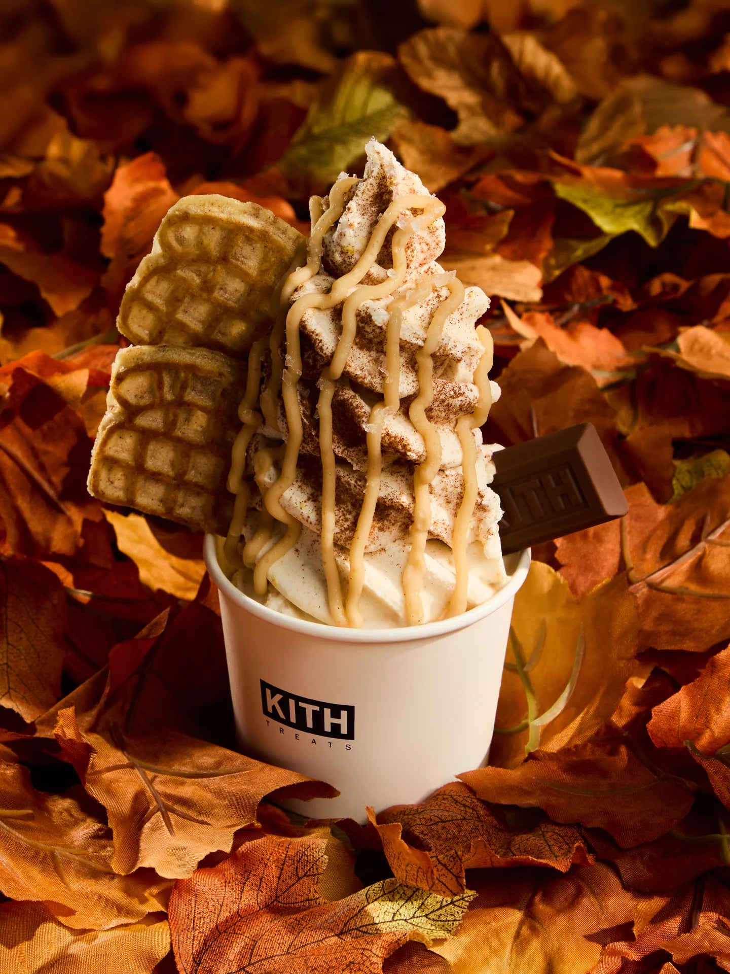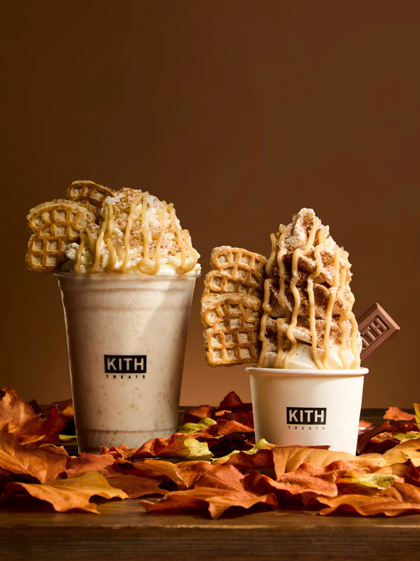 Treats Maple의 출시와 함께, Kith Treats는 황금빛 메이플 시럽이 녹아든 시그니처 바닐라 아이스크림을 베이스으로, 이번 캡슐 컬렉션의 그래픽을 그대로 맛으로 표현한 한정판 아이스크림 스월 & 밀크셰이크를 선보입니다. 컬렉션과 스페셜 메뉴가 함께 어우러져 가을의 정취를 완벽하게 담아내며, 선선한 공기, 포근한 레이어, 그리고 풍부한 가을의 맛이 만나는 순간을 선사합니다.