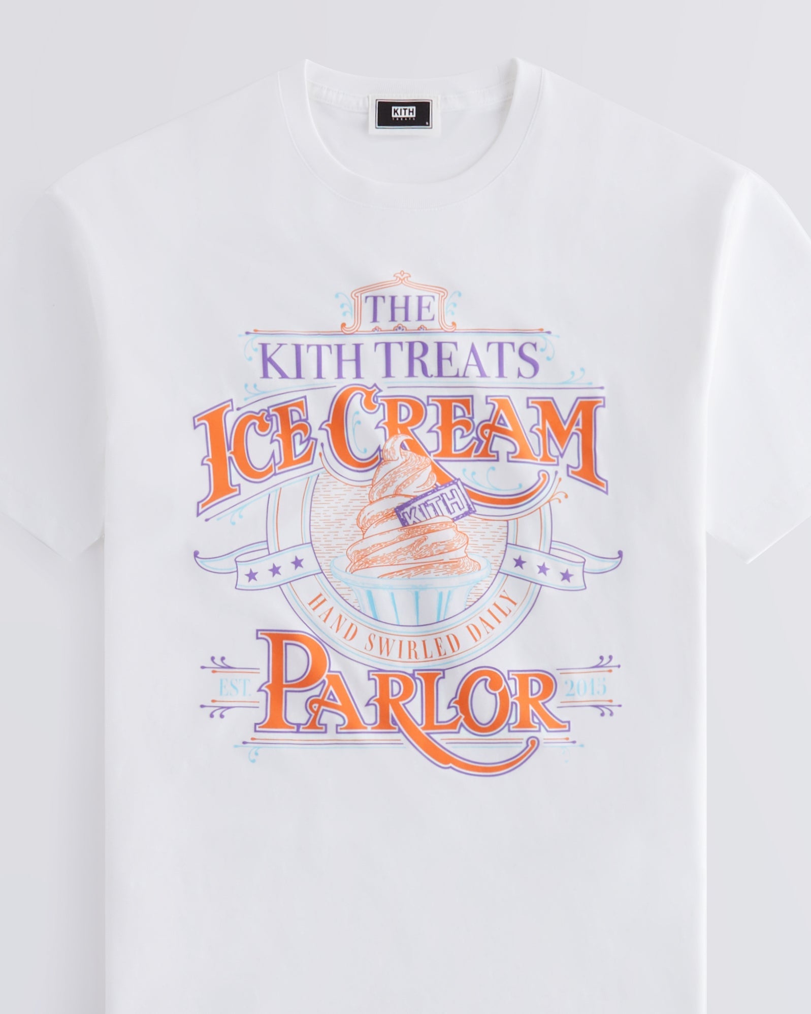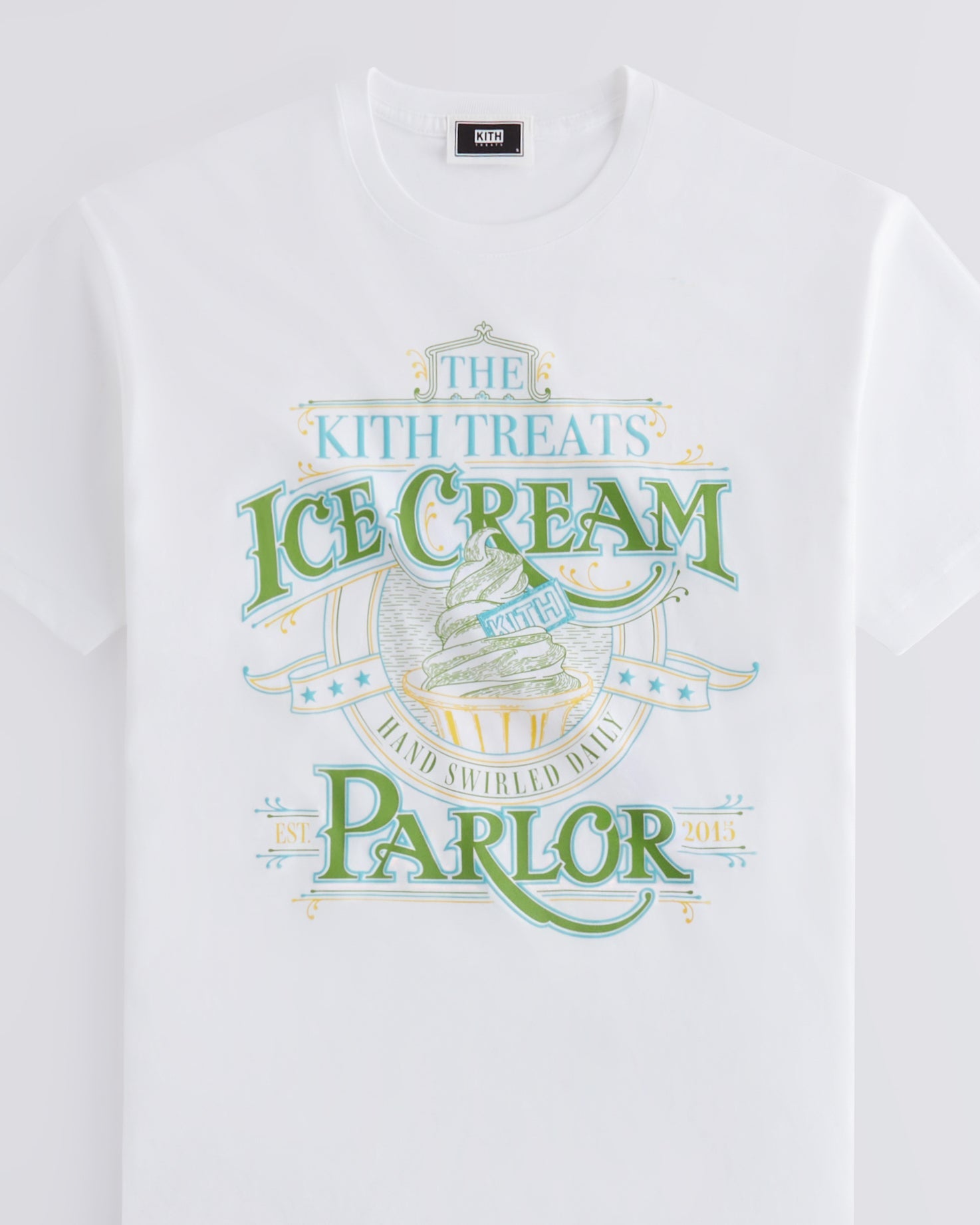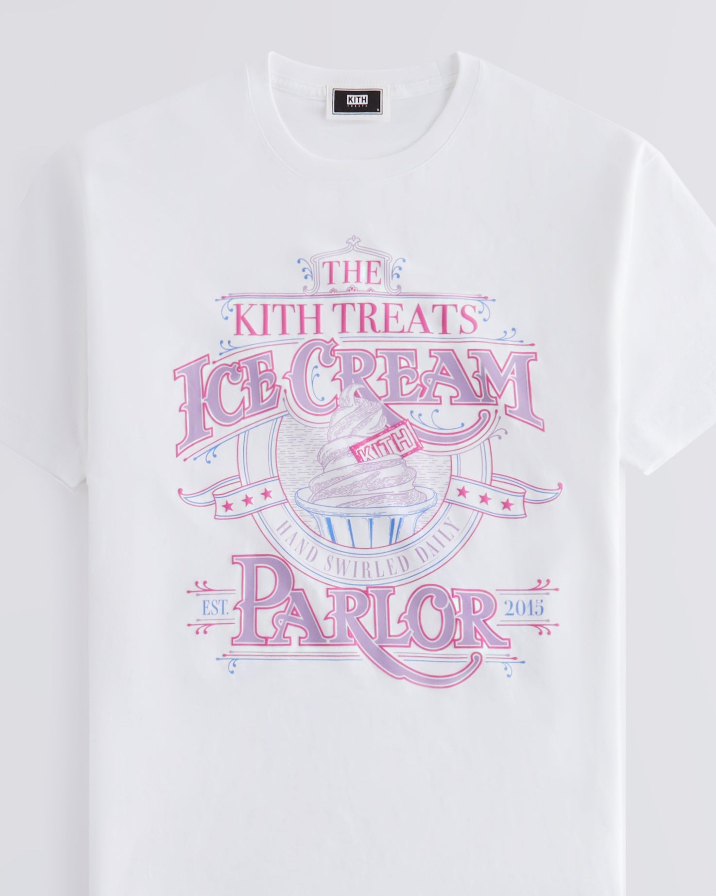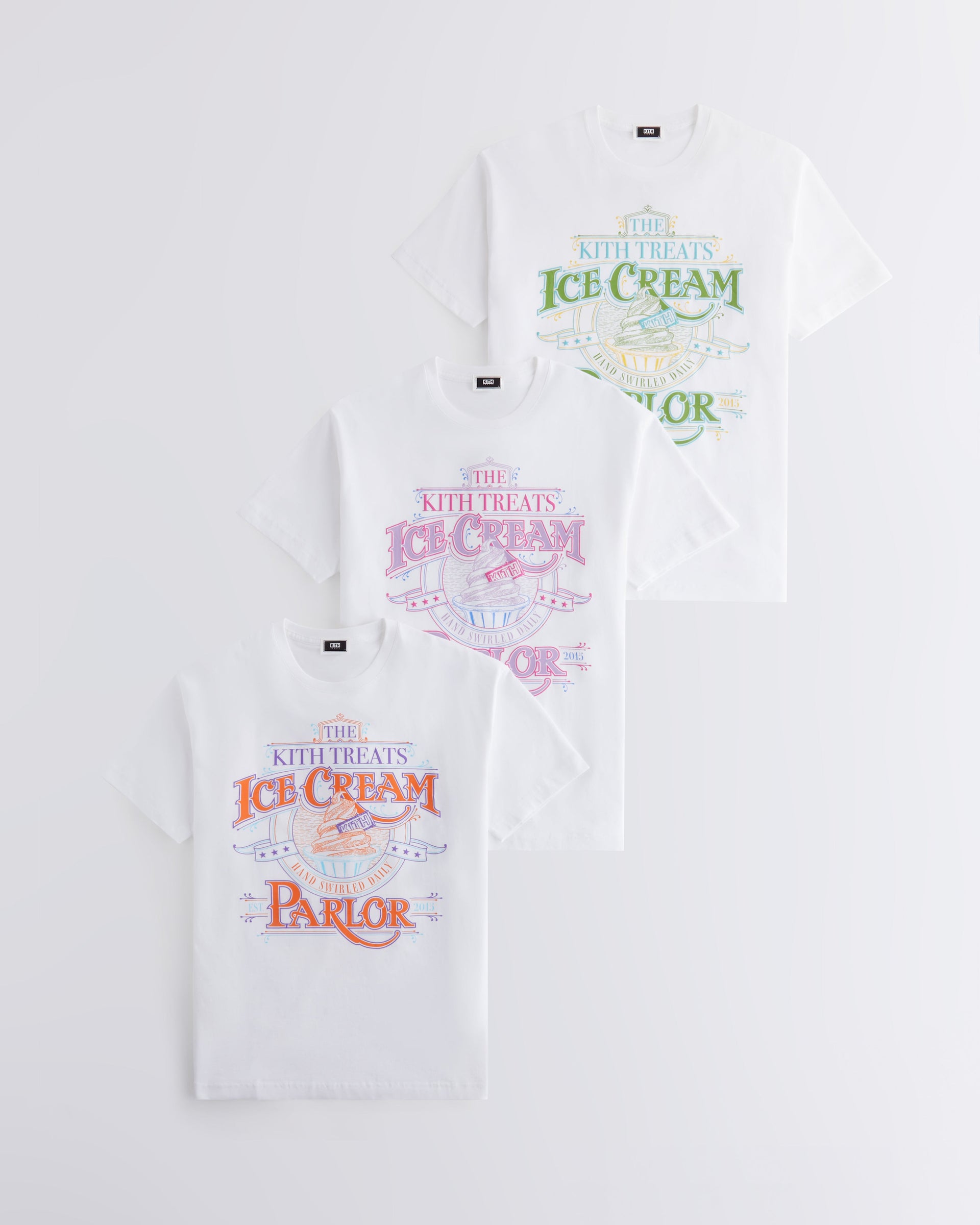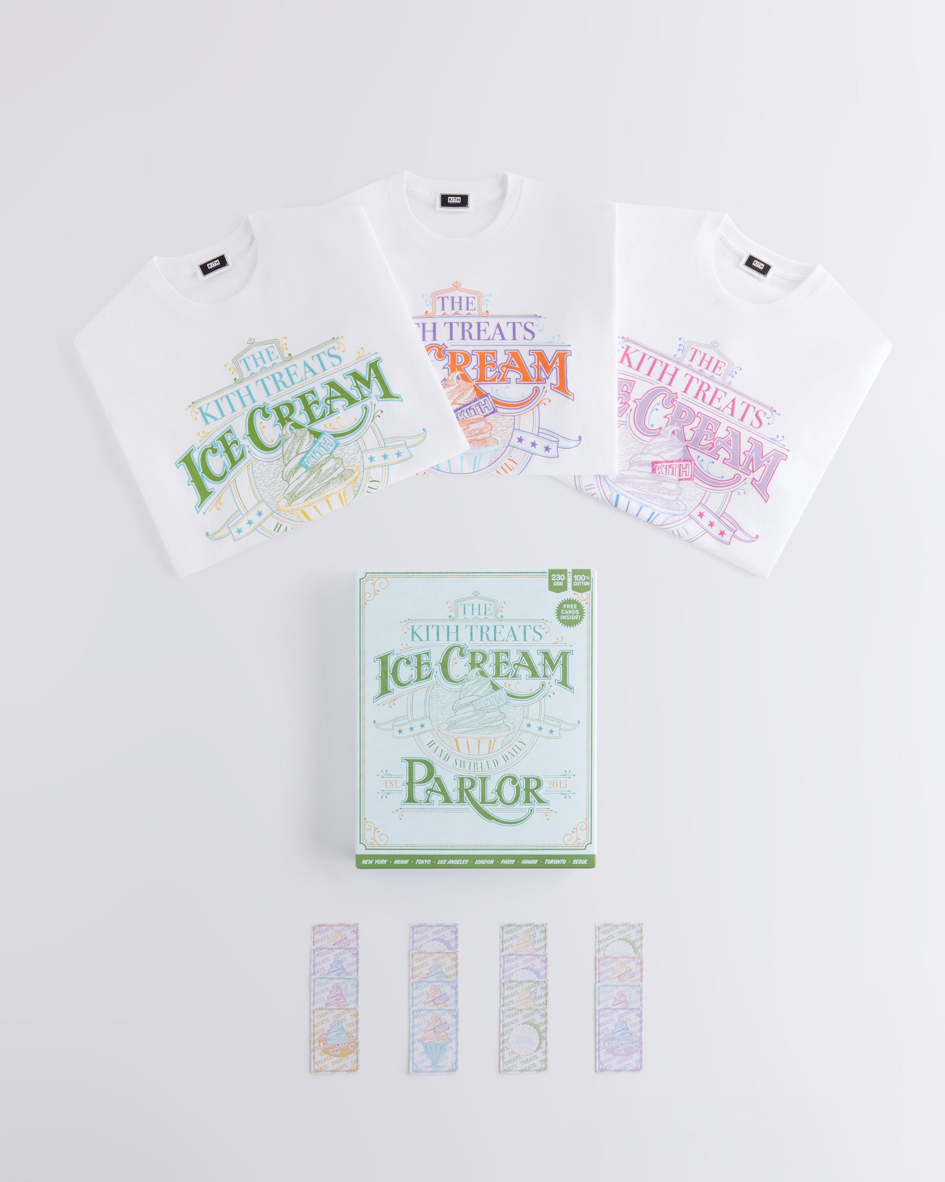 와플의 날(National Waffle Day)을 기념하며, Kith Treats는 세 가지 경쾌한 색상으로 구성된 장식적인 그래픽 티셔츠 트리오인 트리츠 팔러(Treats Parlor)를 선보입니다.이 캡슐 컬렉션은 레트로 아이스크림 가게의 도상학(icognography)에서 영감을 받은 일러스트 디자인이 특징입니다. 각 티셔츠는 시리얼에서 영감을 받은 커스텀 상자에 포장되어 있으며, 16장의 메모리 매칭 카드 게임이 포함되어 있습니다.